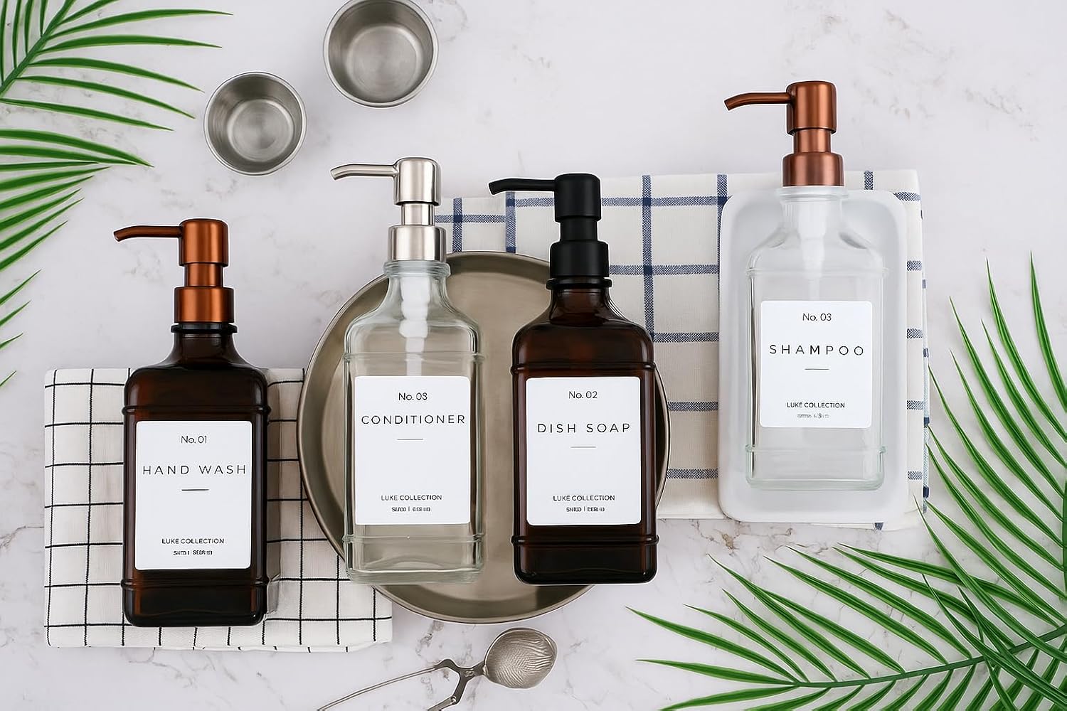 - β 5 WATERPROOF LABELS: Now with 5 stickers, it's your choice to use the Kitchen Soap Dispenser Set with Dish Soap for hand soap, dish wash, lotion, conditioner, or shampoo. To clean the lotion dispenser set for the bathroom and kitchen sink soap dispenser set, just run the bottle under water and watch any residue simply wash off. With our exclusive no-leak pump, the bottle enables you to put out a good amount of soap with a single pump.