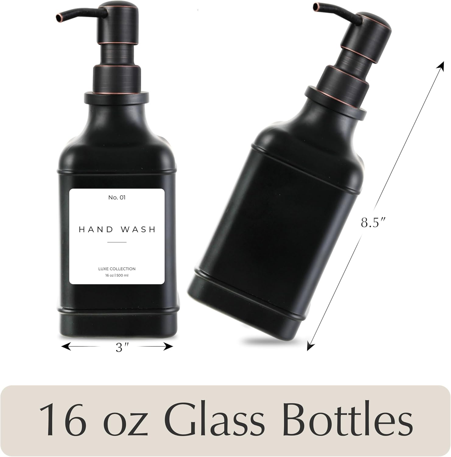 - β PREMIUM QUALITY THAT LASTS: Designed to complement any space, these 16 oz glass soap dispensers are perfect for hand soap, dish soap, lotion, or shampoo. Ideal for sinks in your kitchen, bathroom, laundry room, or guest bath. Unlike dispensers that peel or break down, our bottles are made from thick, durable glass that resists wear and looks elegant on any countertop.