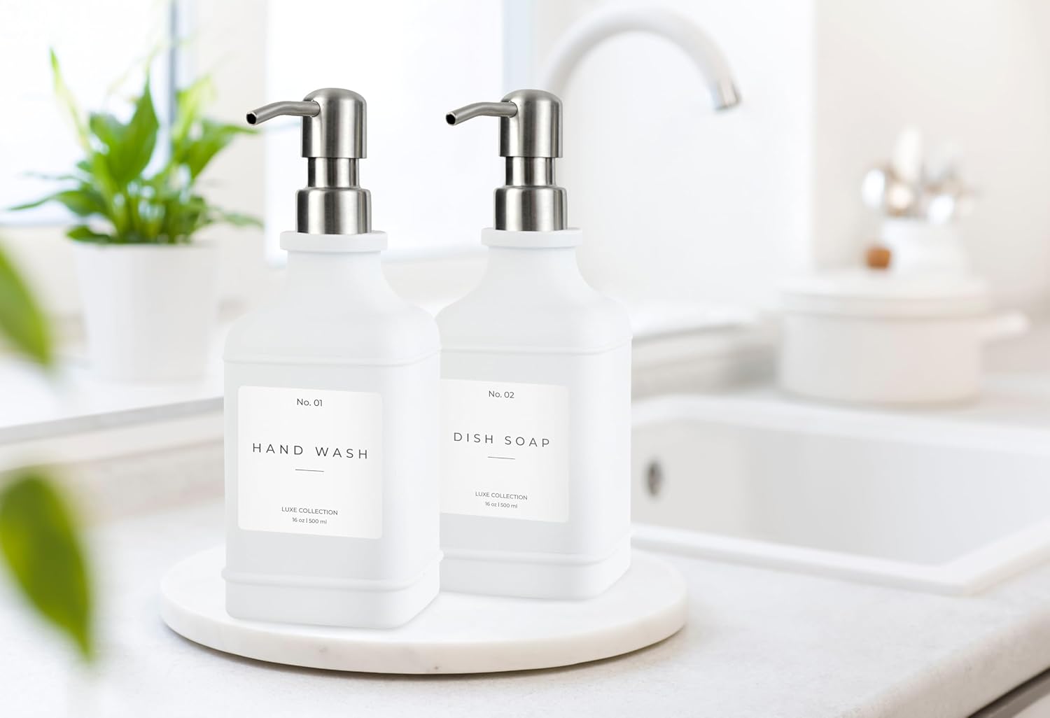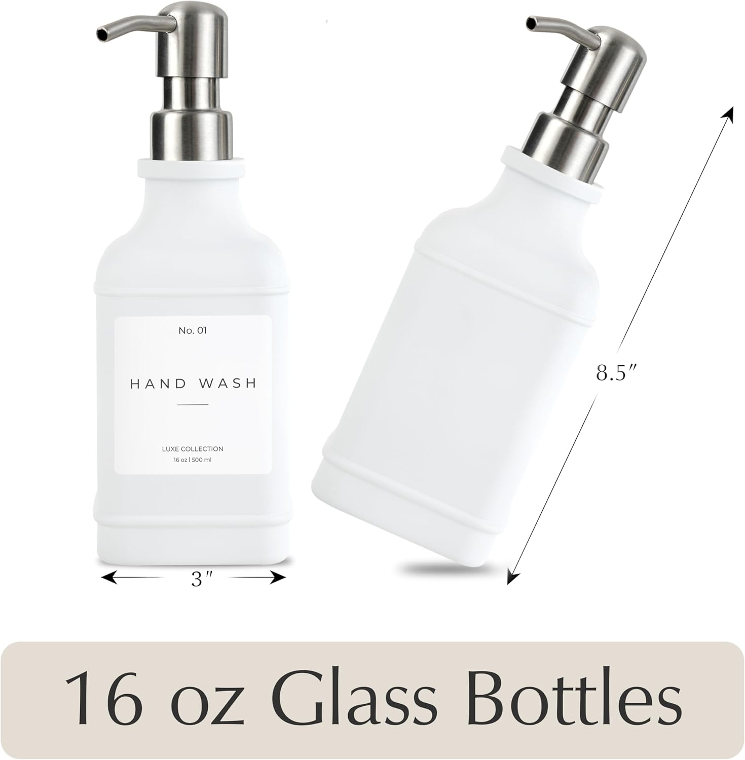 - β 2 PACK: While other dispensers peel over time, our dispensers are made of premium quality and last far longer. The bathroom soap dispensers and kitchen soap dispenser set are 16 ounces and are refillable, requiring fewer refills. Ideal for using as a bathroom soap dispenser set and the glass soap dispenser with pumps boast 2 cc stainless steel pumps.