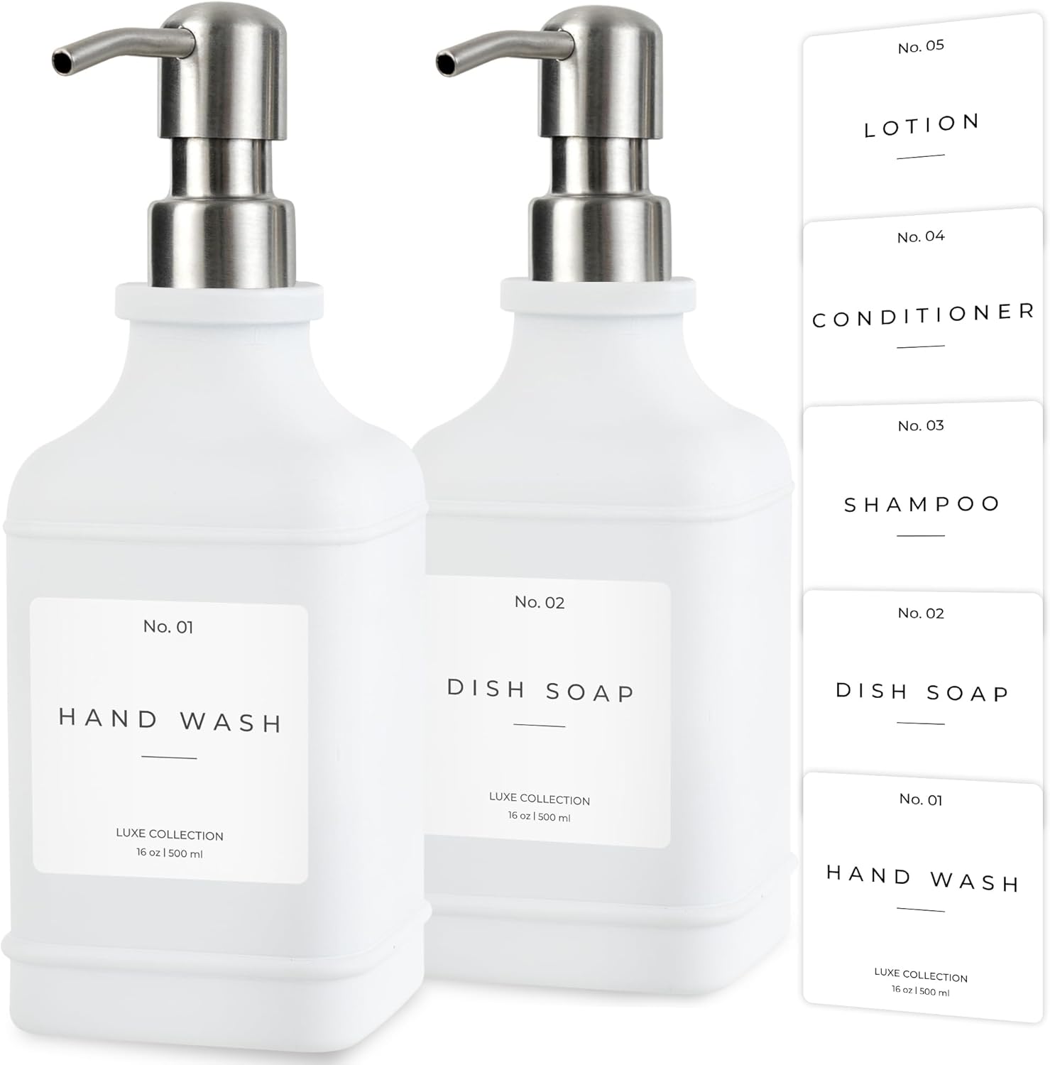 - β 5 WATERPROOF LABELS: Now with 5 stickers, it's your choice to use the Kitchen Soap Dispenser Set with Dish Soap for hand soap, dish wash, lotion, conditioner, or shampoo. To clean the lotion dispenser set for the bathroom and kitchen sink soap dispenser set, just run the bottle under water and watch any residue simply wash off. With our exclusive no-leak pump, the bottle enables you to put out a good amount of soap with a single pump.