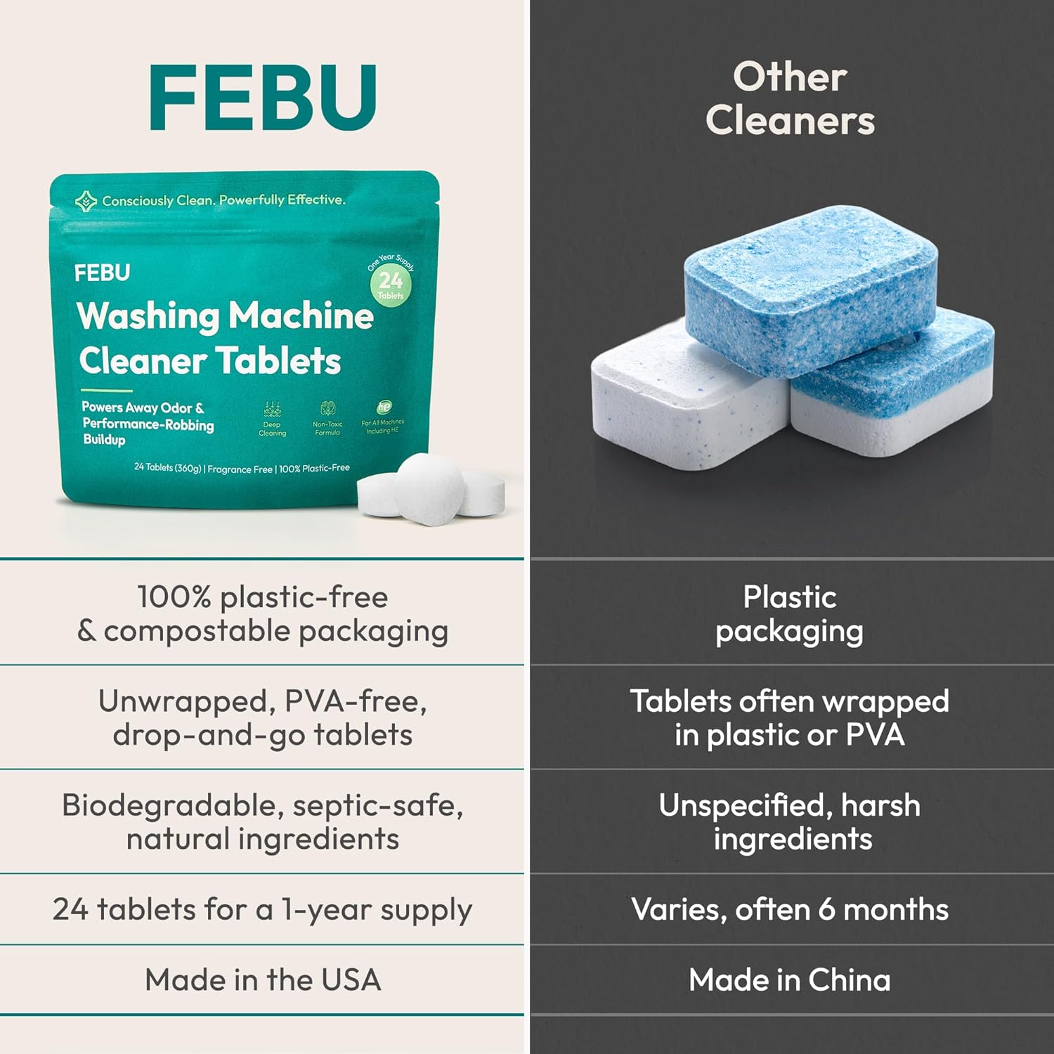 FEBU Washing Machine Cleaner Tablets Made in USA | Washer Machine Cleaner Tablets & Deodorizer | Removes Gunk & Grime | 7 Natural, Biodegradable, Plant-Based Ingredients | 24 Tablets - 12 Month Supply