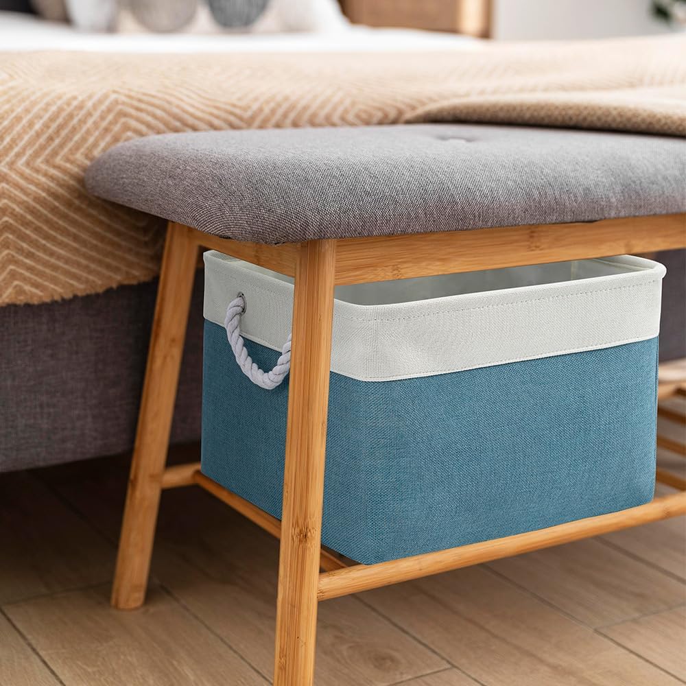 - With modern and stylish design, our storage baskets combine both of the decorative and practical forms. All of our baskets are made of fabric like cotton, linen. They are stylish, sturdy and reusable. These small storage bins can be a beautiful and functional accent to any room. They are not only household life good helpers but also charming decorations
