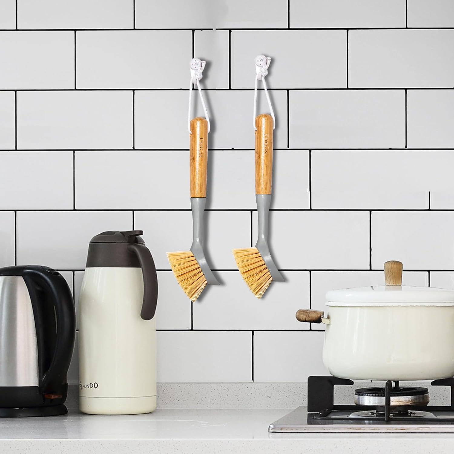 - [Eco-Friendly] This kitchen brush built with sturdy eco-friendly and comfortable natural bamboo handle, non-scratch and odorless bristles. The Kitchen brush with scraper scrub brush head, can easily removes stuck-on food, and dish scrubberโs handle has hanging loop for hanging to drying & storage.