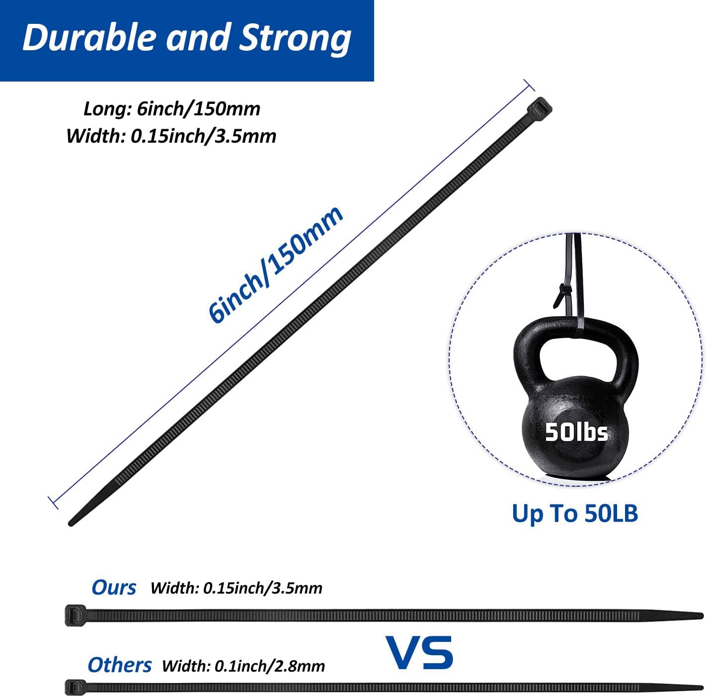 - 50 Set Adhesive Cable Zip Tie Mounts: 50 pcs 3/4" x 3/4“ black adhesive mounts and 50 pcs 6 inch x0.14 inch black nylon zip ties .