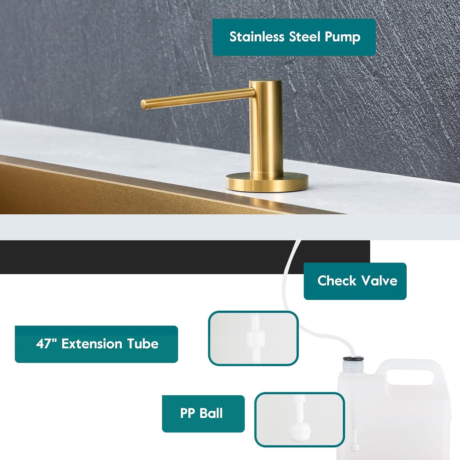 - No More Messy Refills: Our sink soap dispenser pump is equipped with a 47" extension tube, you can insert the tube directly into the large dish soap dispenser. No need to refill small canisters anymore