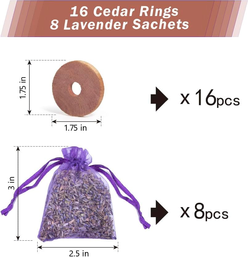 - Included: 16 small red cedar rings, and 8 lavender flower sachets. Shake the bag or squeeze the sachets a little before use for a strong lavender fragrance.