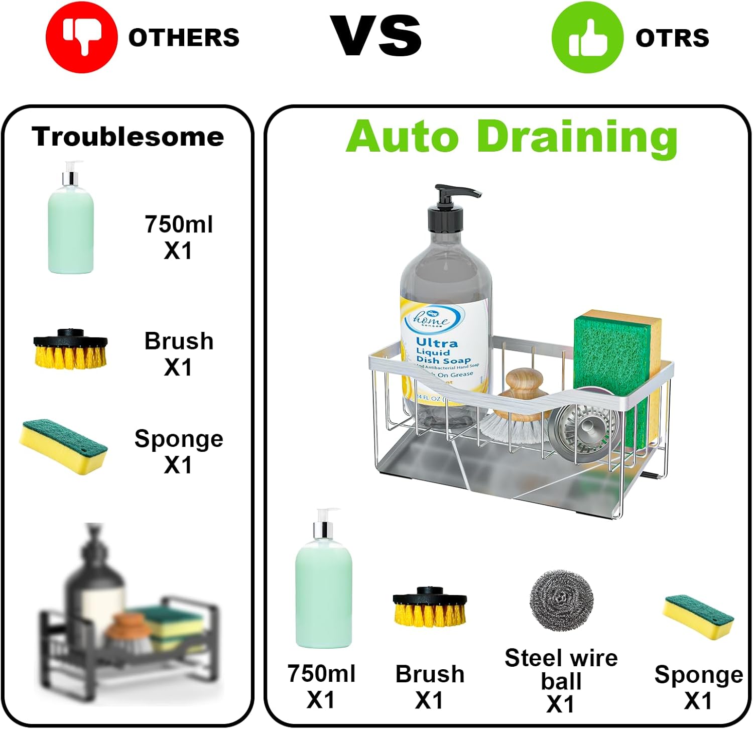 Vanwood Sponge Holder for Kitchen Sink with Auto Draining Tray, Sink Caddy Kitchen Sink Cocina Organizer, Self Drain Dish Soap Sponge Caddy for Counter (304 Sus Stainless Steel)