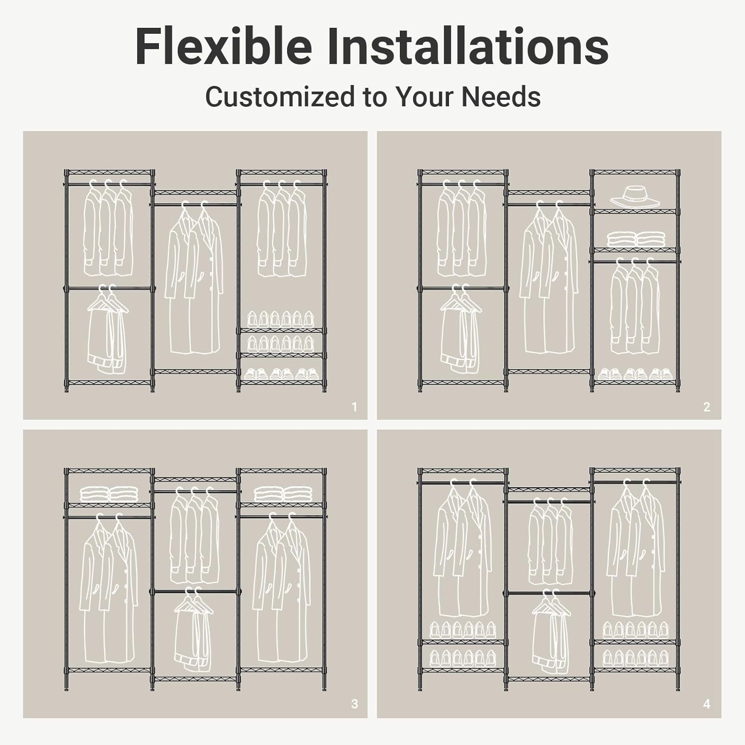 - Easy to Assemble: Our closet rack is easy to assemble with clear instruction. Certain shelves must be installed in a particular order. Except for the manual, you can also refer to the installation video on the page.