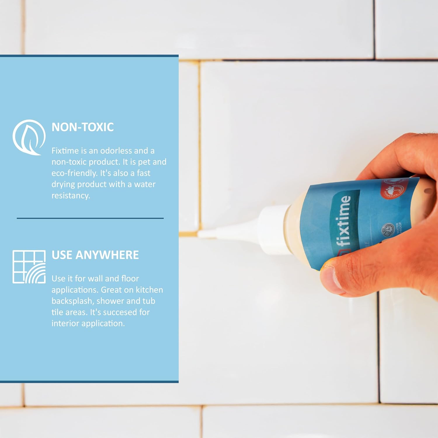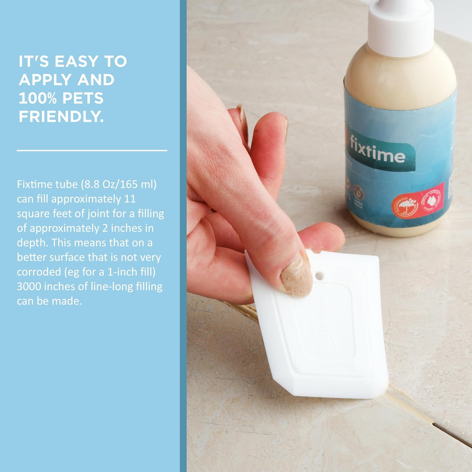 - EASY USAGE: It's fast drying formula; therefore, it's easy to apply and 100% pets friendly. Both DIY and professional friendly in only takes a warm pail of water, sponge and paper towel along with Fixtime. Always clean the area first then dry the entire area fully. Apply the desired amount of Fixtime to the intended area. Spread the Fixtime evenly by using our squege like a back side of trowel. Make sure there is no gap or bubling left throughout your grout joints.