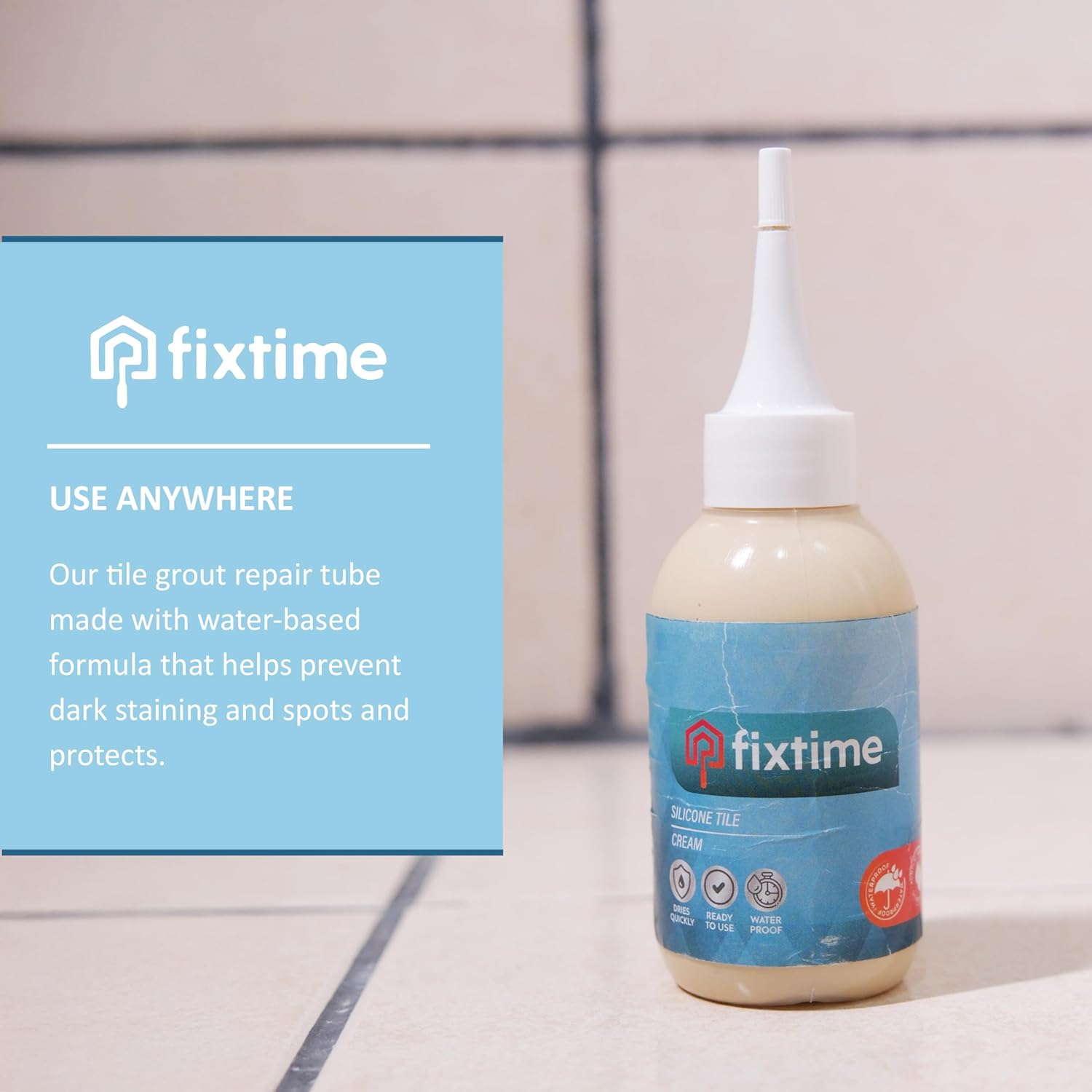 - FORMUL: Our formula is water based and non-toxic. Water-based formula that helps prevent dark staining and spots. Great for home imporment and upgrades.Advanced water-based formula helps prevent spot formations while it provies protection against grubby grout. It also provides richer color pigments. Our odorless formula is safe for your family and pets. Fixtime restores your bathroom, kitchen and pool tiles without a hustle!