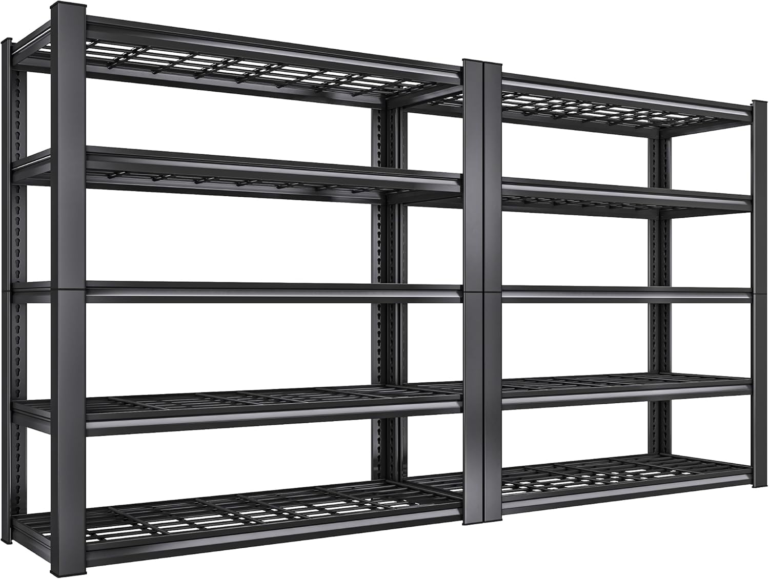 - ă3010LBS Extremely SturdyăThis garage shelving heavy duty has thickened legs. Every solid thickened metal shelf with extra stiffener can hold up to 602 lbs, a total of 3010 lbs bearing capacity gives you good storage experience. No matter how much weight you put on it, the garage storage shelves heavy duty will not wobble or shake