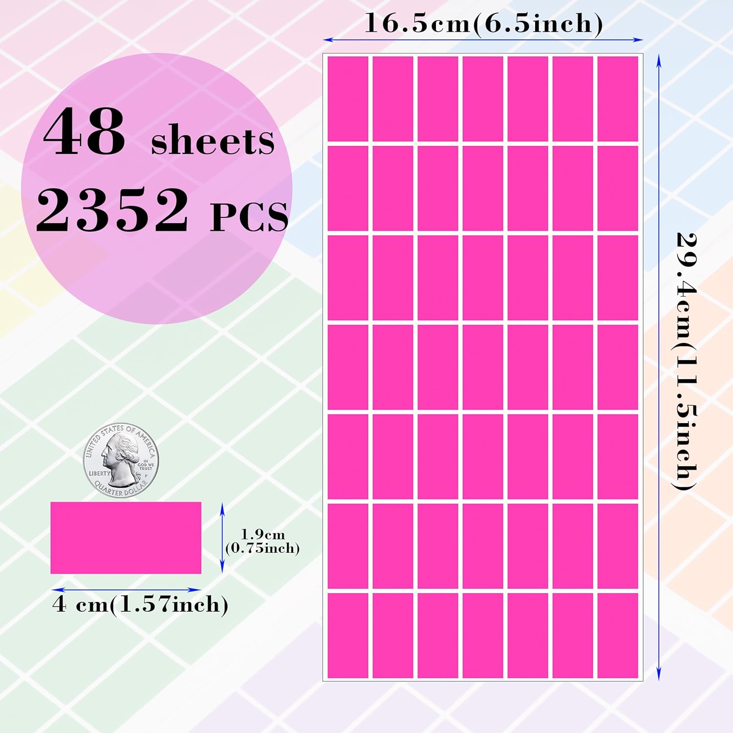 - 【Size - Rectangular Color Stickers】Each colored coding label is 1.57 inch x 0.75 inch (40mm x 19mm) in diameter, with a paper size of standard letter size: 11.6 x 6.5 inch. There are 48 sheets with a total of 2352 color coding labels,196 pieces per color, Rectangular labels perfect to use in your home, office and more projects.