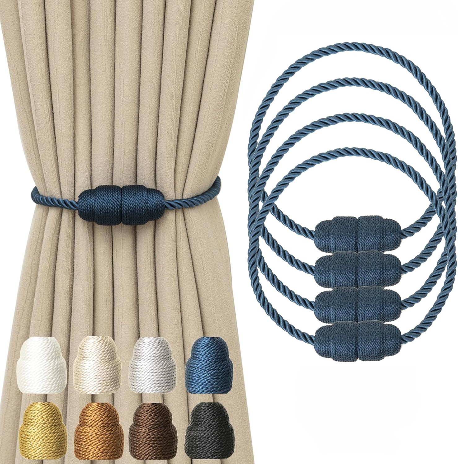Magnetic Curtain Tiebacks - Rope Tiebacks for Curtains & Drapes, Decorative Window Holdbacks (4 Pack, Blue)