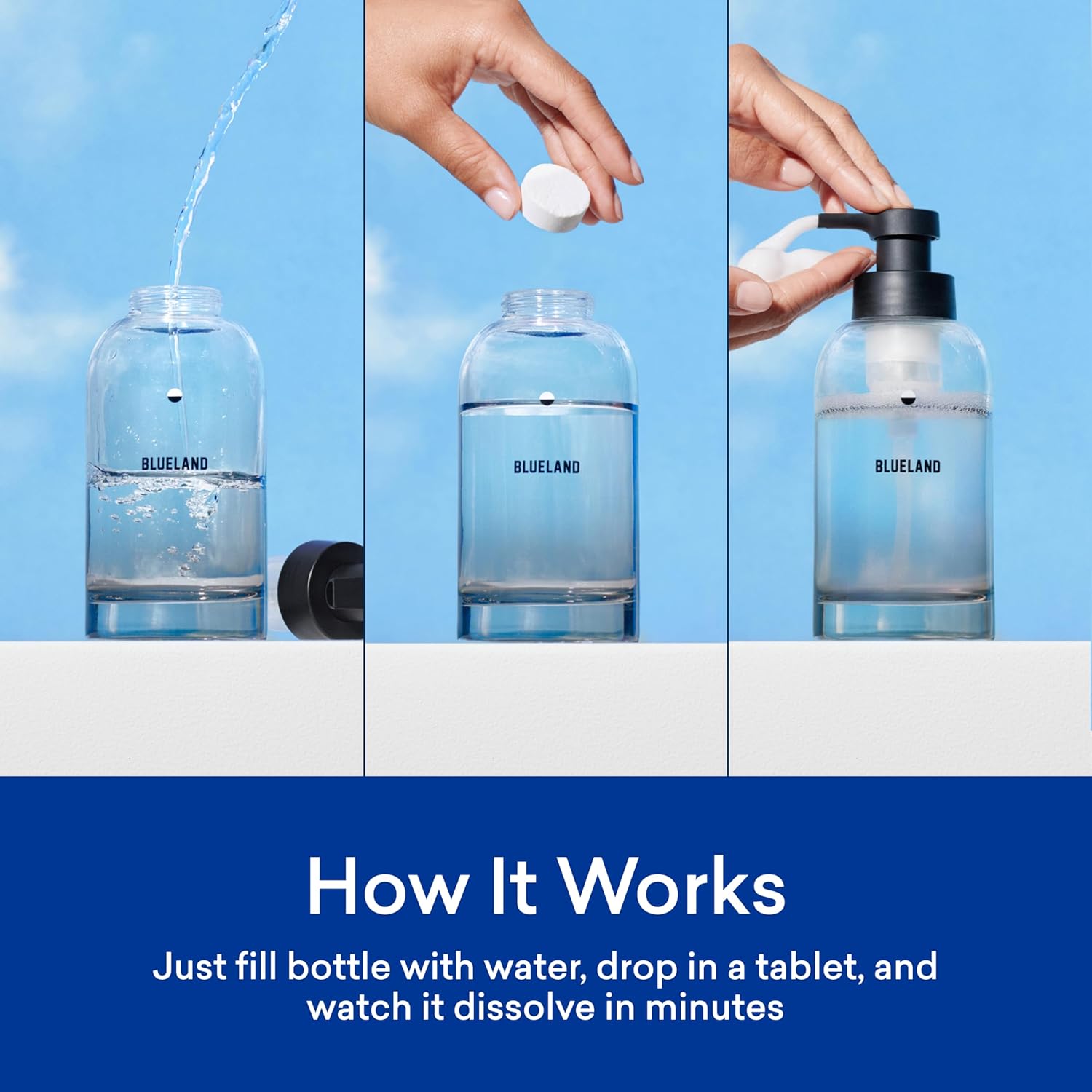 - HOW IT WORKS. Fill your bottle with water to the half-round symbol or line, and drop in a tablet. Allow the tablet to fully dissolve to make 9oz of rich Foaming Hand Soap.