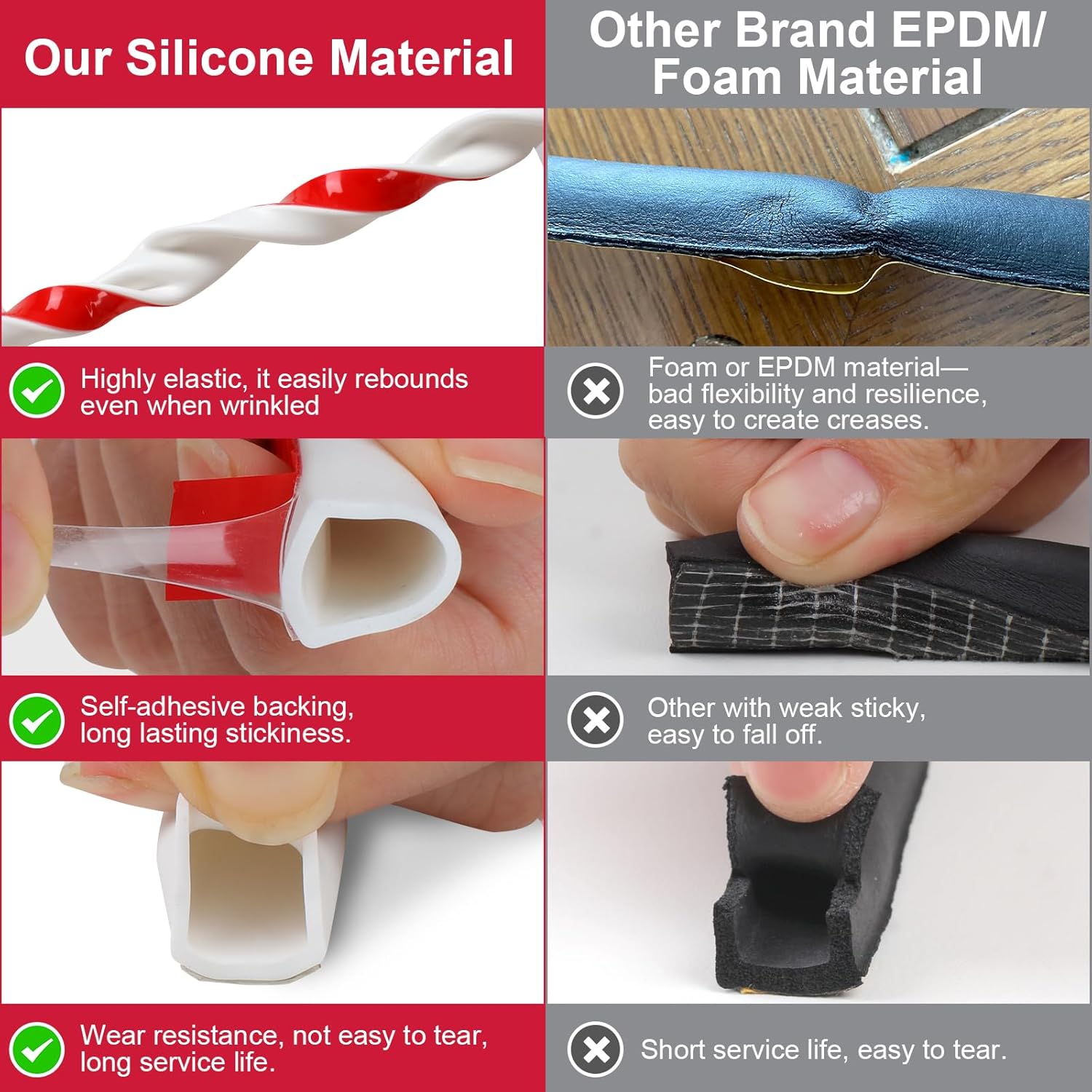 - High-Quality Silicone Material: Our door seal strip is made from premium silicone, offering greater durability and flexibility compared to foam or EPDM rubber strips. Silicone withstands temperatures up to 200°C, remains flexible in cold conditions, and resists cracking, ensuring long-lasting durability