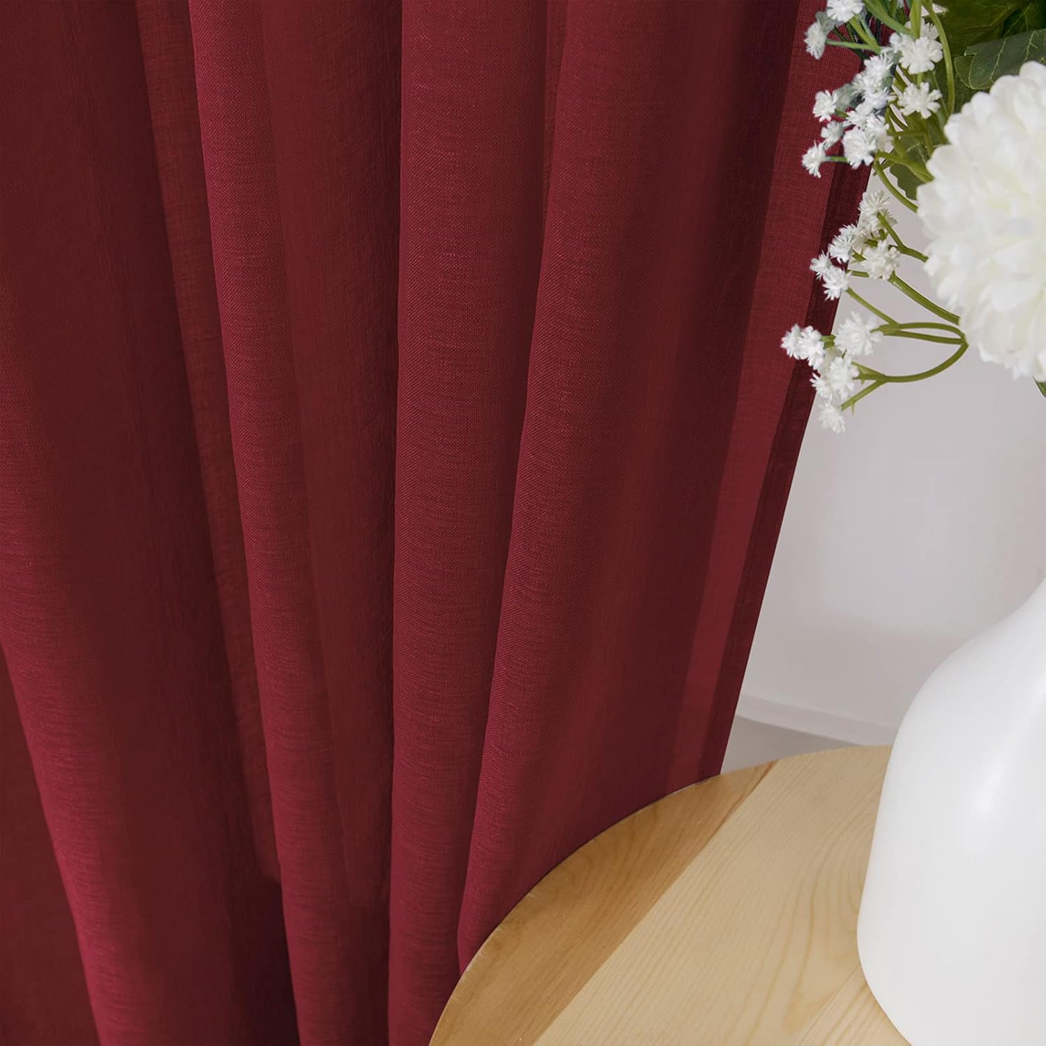 - Light Filtering: The linen look burgundy red sheer curtains can allow the right amount of natural light through to bring your room a hazy and softer vision, keep you away from someone’s glance from outside and provide you some privacy.