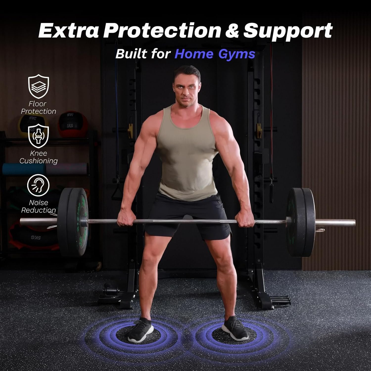 - [Upgraded Dual-Layer Design]: Concerned about your equipment scratching the floor during workouts? Our 2in1 Rubber Top EVA Foam Exercise Gym Mats are crafted to solve this issue. The textured rubber top layer, combined with a high-density EVA foam bottom layer, seamlessly creates a non-slip tough surface with excellent shock absorption.