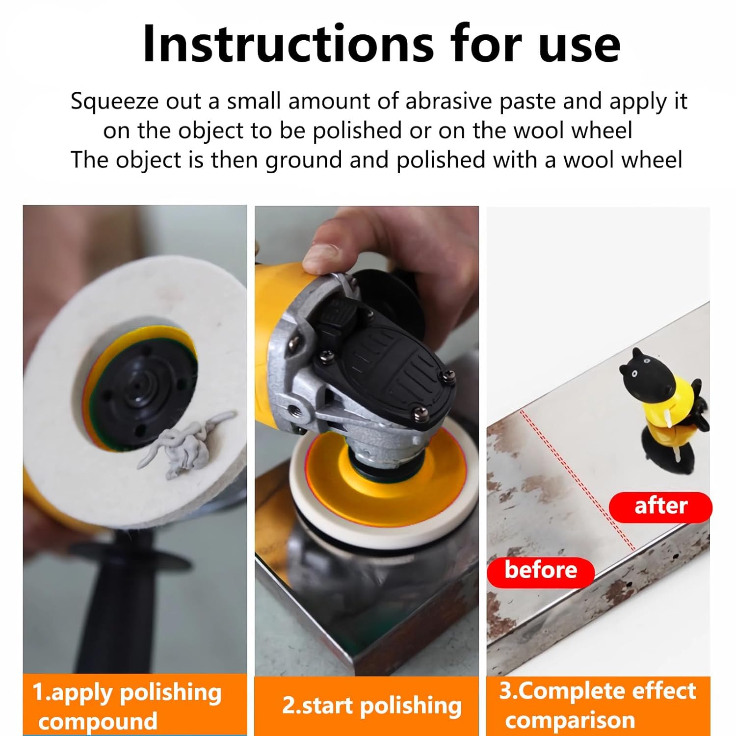 - 【STRONG COMPATIBILITY】 - it widely used Our buffing wheel pads in various surface buffing and cleaning, such as metal derusting, glass and ceramic polishing, marble, automotive and wood floor polishing, etc. And you can use the buffing waxes can be used for polishing, cutting, waxing, cleaning, repairing, restoring, reviving etc. on any material like: Aluminum, Stainless, Steel, Brass, Cast-iron, Auto Body car work, Appliances & Jewelry.