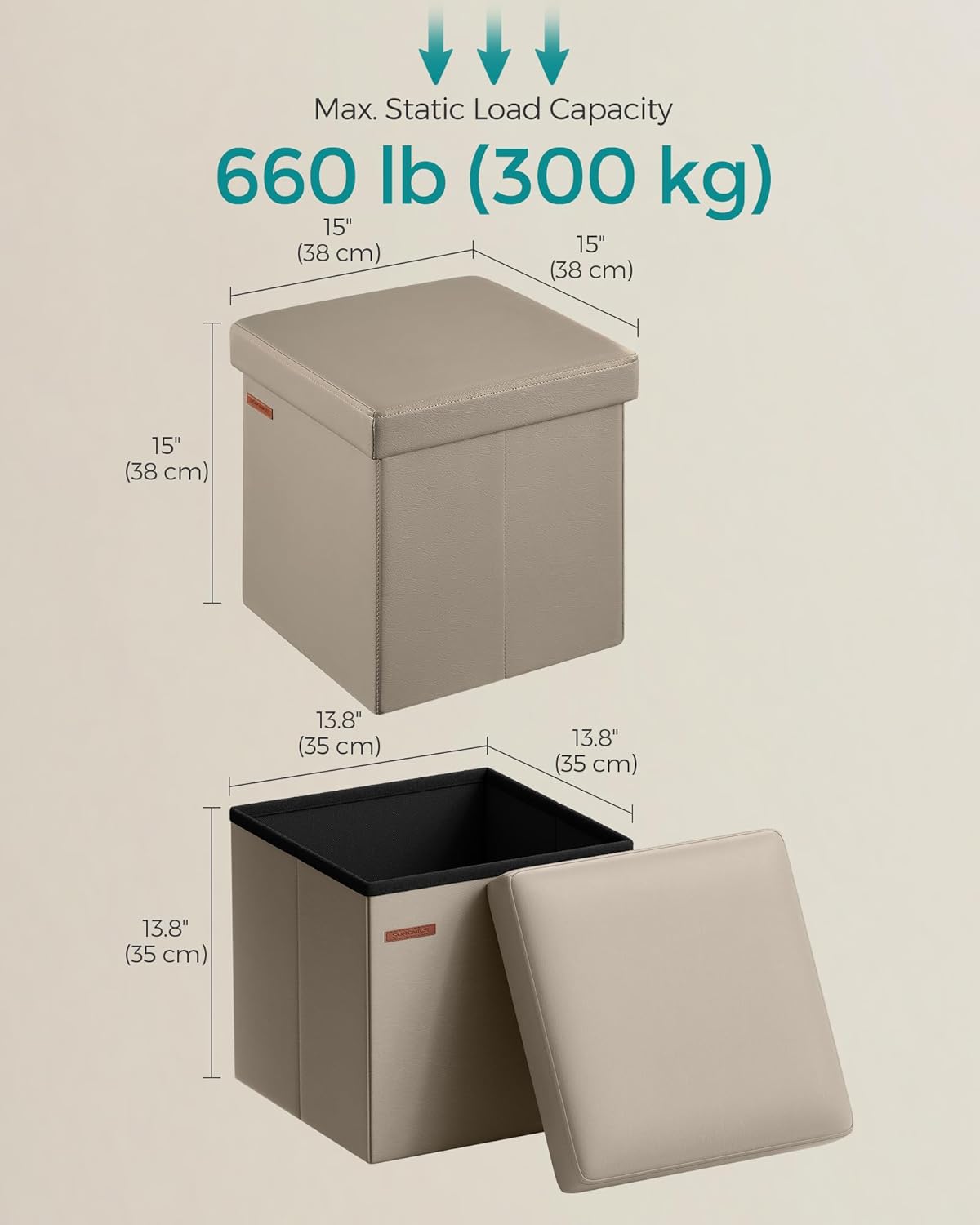 SONGMICS Mazie Collection - 15 Inches Ottoman with Storage, Footstool, Storage Ottoman, Load 660 lb, for Dorm, Living Room, Bedroom, Synthetic Leather, Camel Brown ULSF010K03