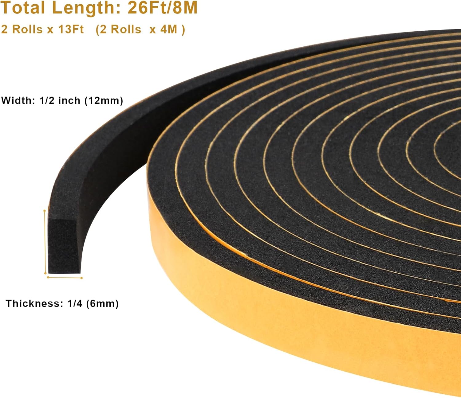 Weather Stripping 1/2 in x 1/4 in, High Density Foam Insulation Tapes, Weatherproof Seal Strips, Soundproof Weatherstrip for Door Window, 2 Rolls Total 26Ft
