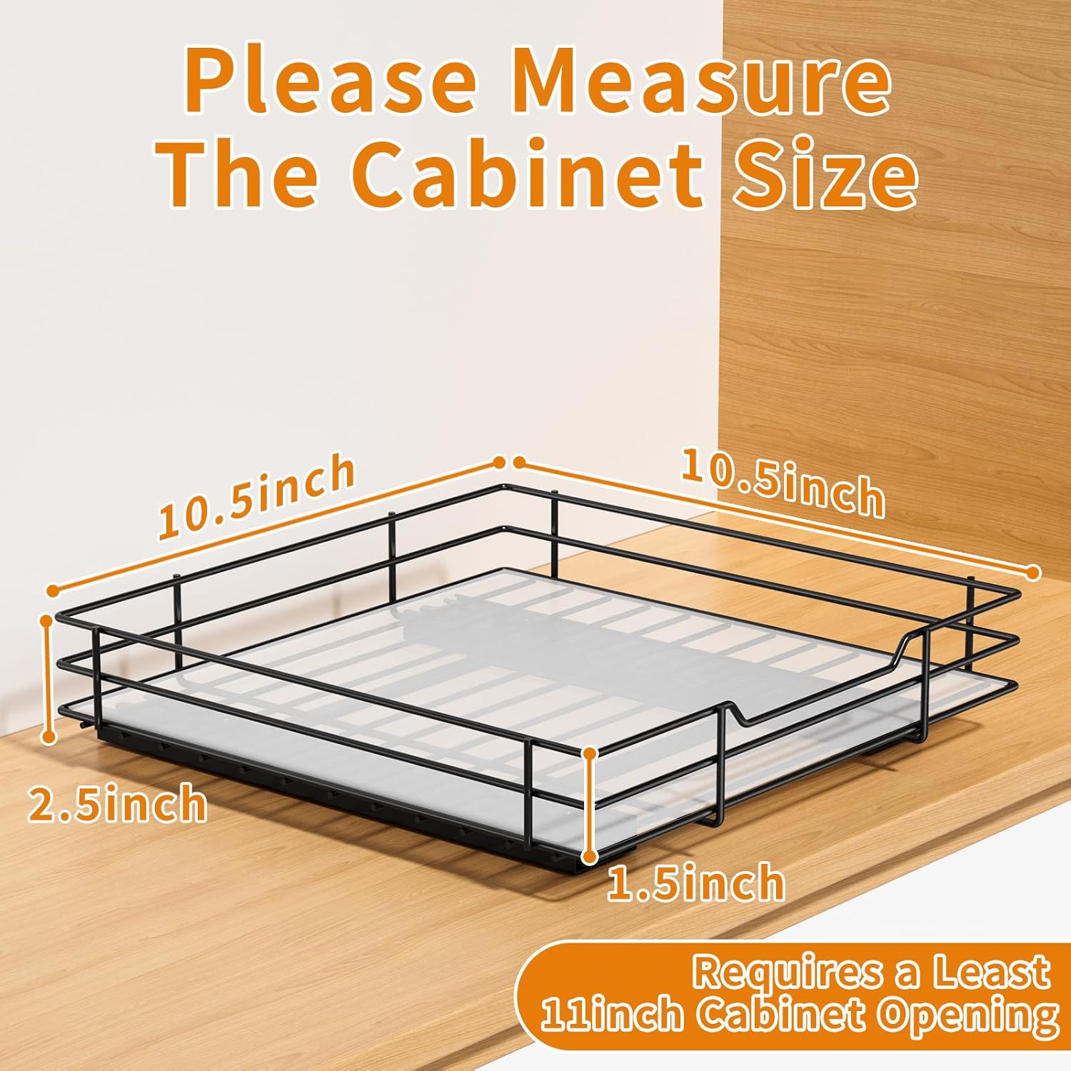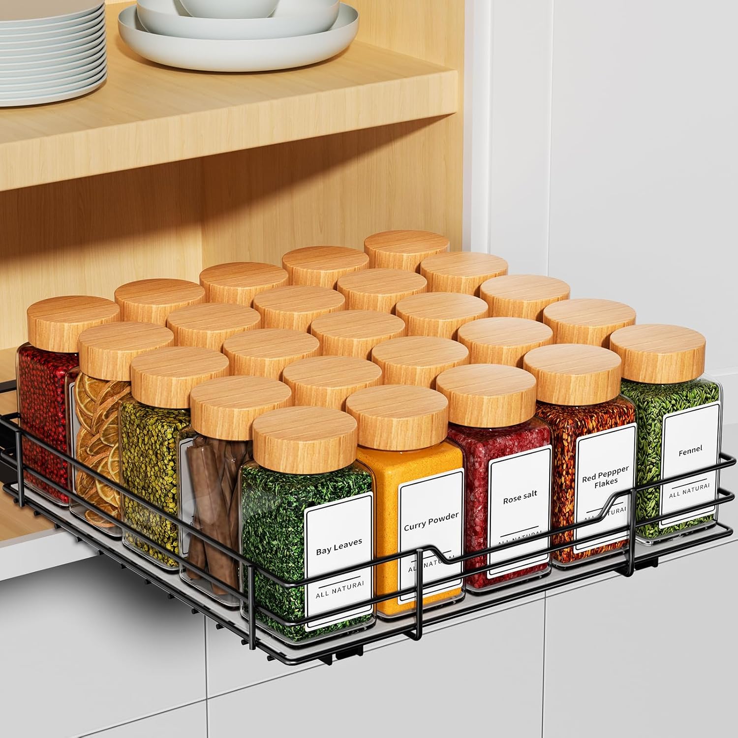- SMOOTH SLIDING & ELEVATED GUARFRAIL- The rails are designed with a ball bearings system to ensure smooth slide, so you can slide the rack with a full load of spice jars effortlessly. Full extension glides offer you easy complete access to all spices inside the kitchen upper cabinets. The spice rack has guardrails, preventing the spice jars from tipping over or drop out of the basket when you pull out the spice rack.
