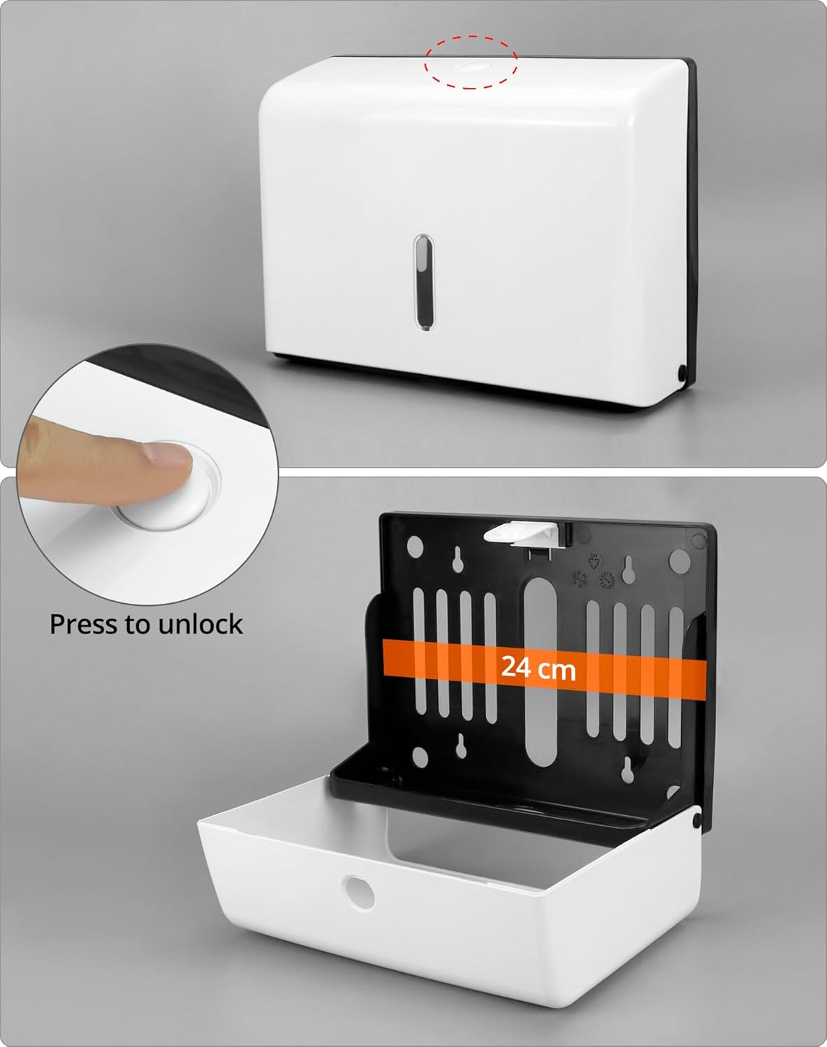 - Locking Protection: They have a press button on the top for unlocking. The locking mechanism prevents unwanted tampering and vandalism to your paper towel dispenser.