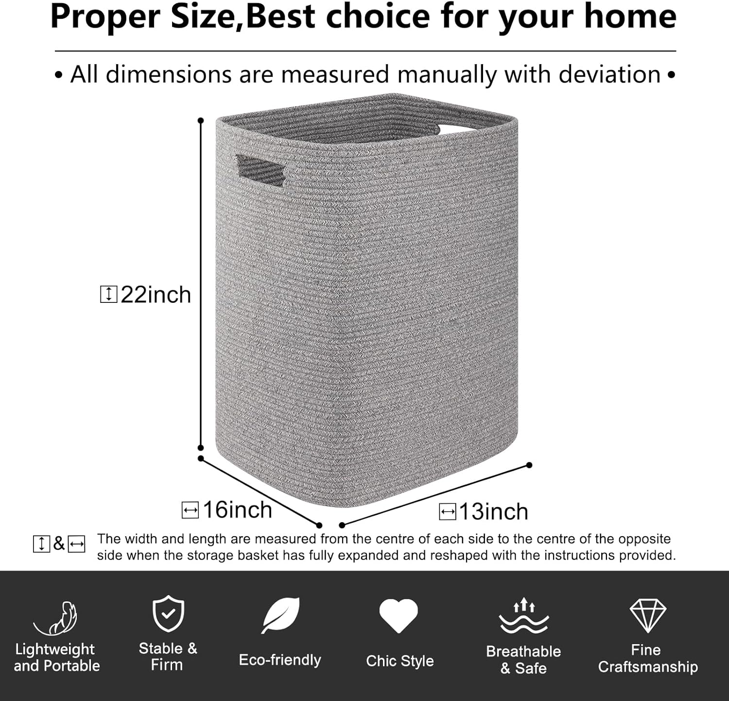 OIAHOMY Laundry Hamper, Laundry Basket,Rectangle Cotton Storage Basket with Handles, Large Blanket Basket for Living room, Woven Decorative Storage for Toys,Clothes,Pillows-16x13x22in-Grey variegated