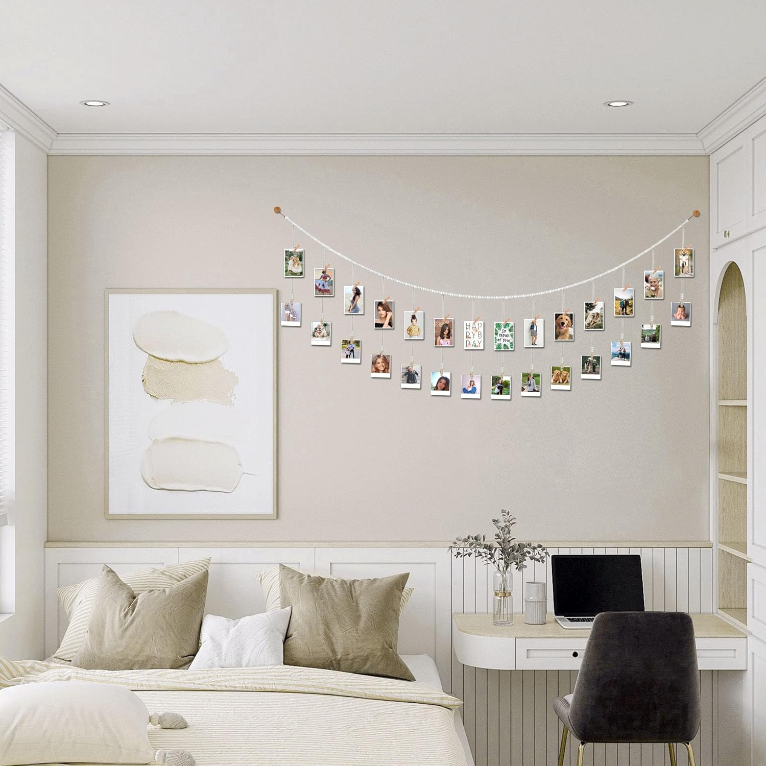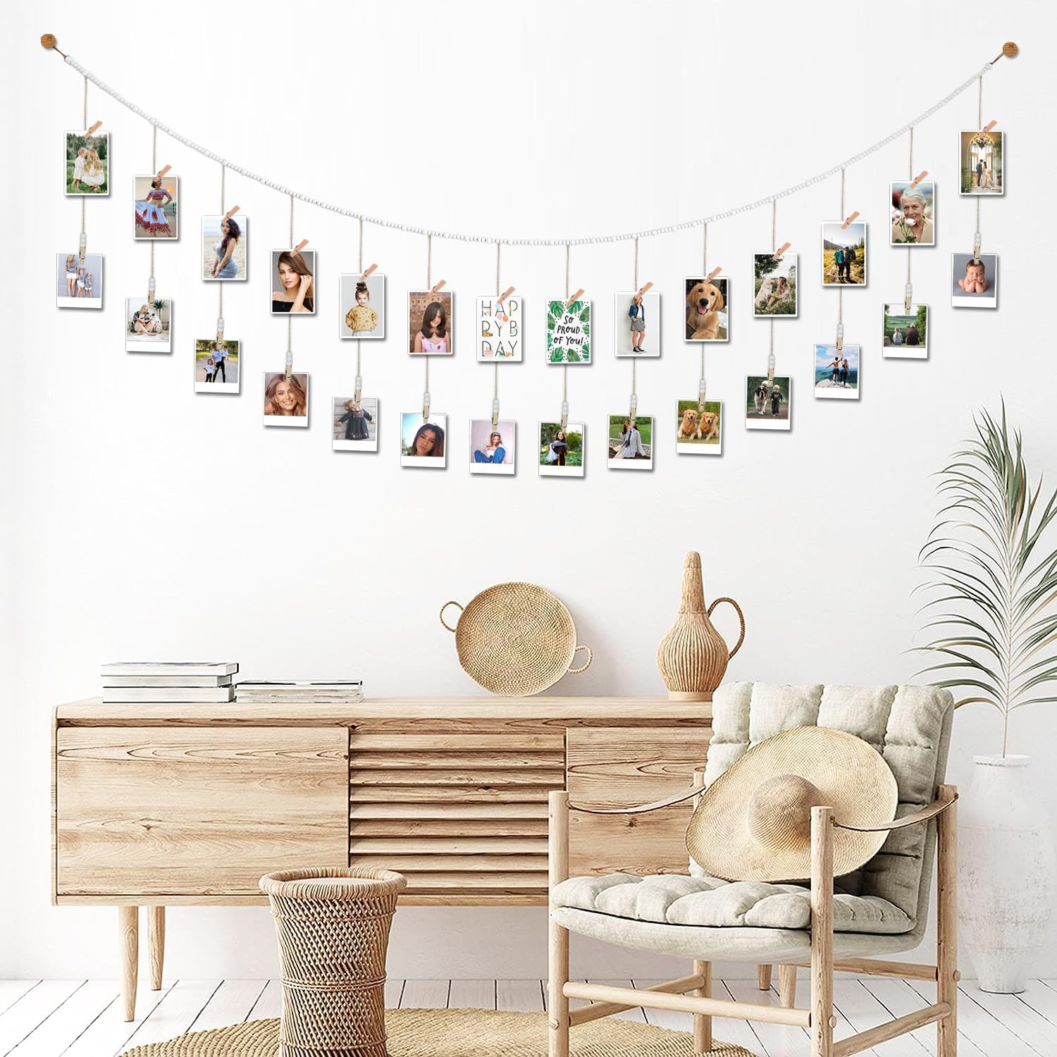 - THE POSSIBILITIES ENDLESS: This beautiful natural wood bead garland with clothespin is perfect for displaying family photos, kids artwork, polaroid photos, homeschool activities, holiday and Christmas cards...