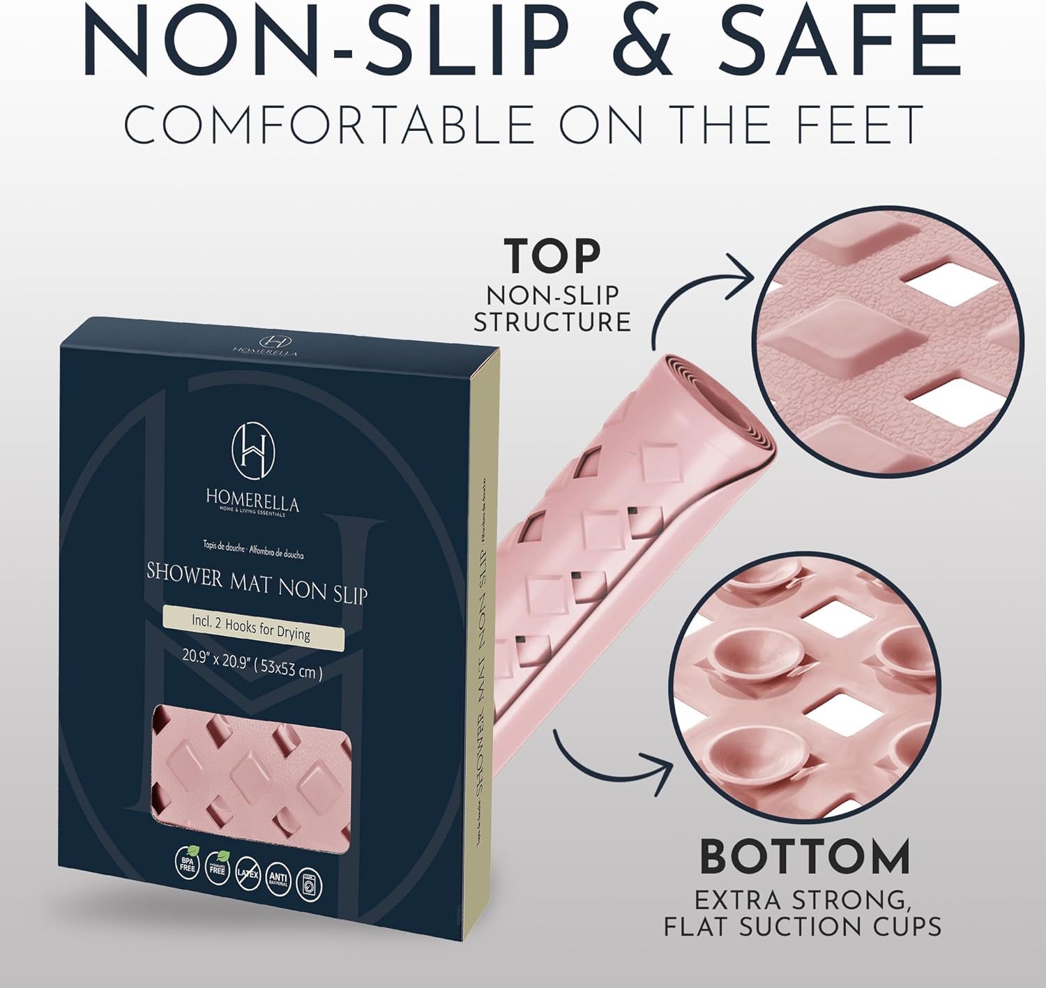 - Non-Slip? Safe & Secure - The Homerella shower mat non slip anti square has over 250 anti-slip suction cups on the bottom for optimum grip. The top of the shower drying mat has a special anti-slip structure!