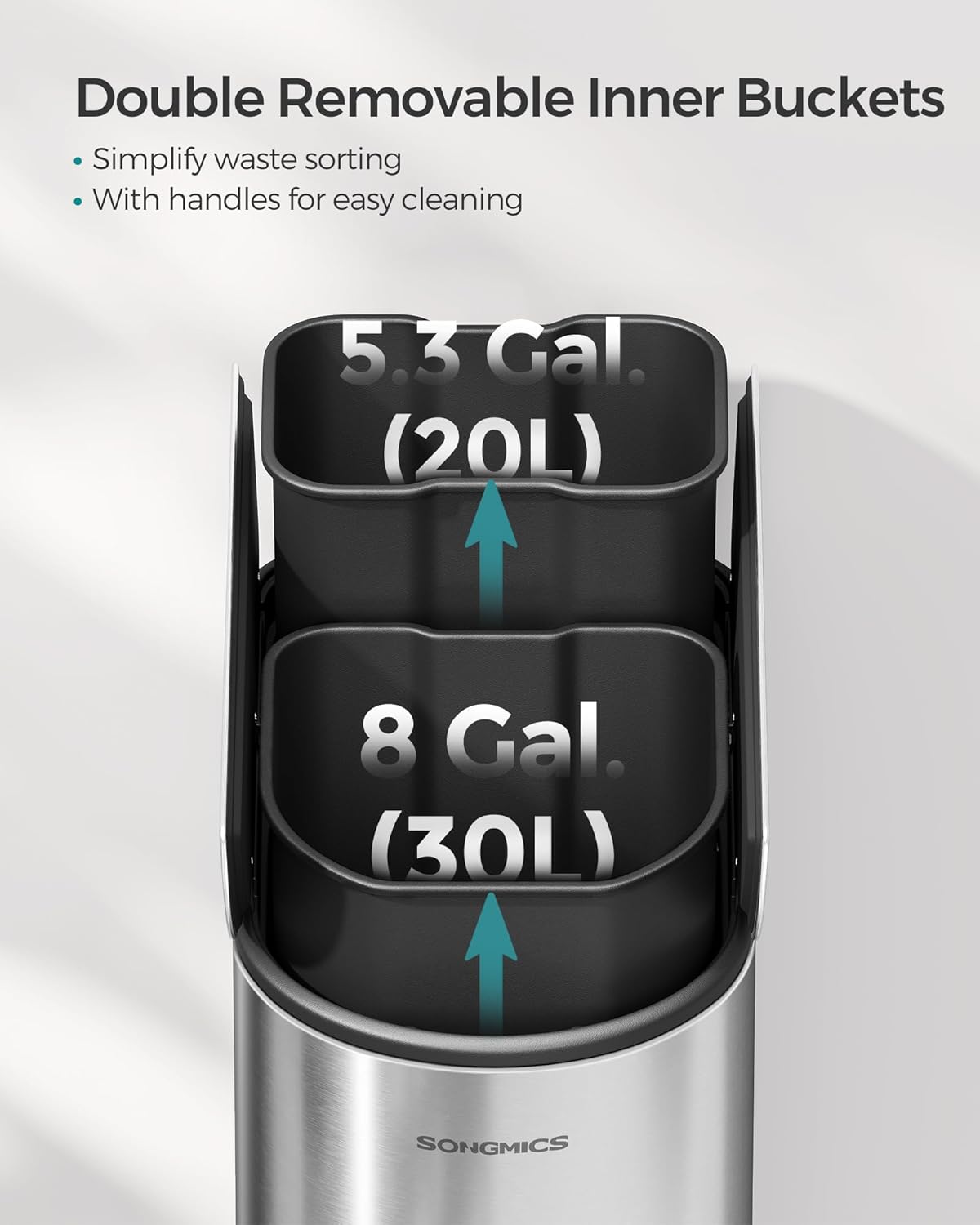 - [Slim Dual-Compartment Bin] This dual trash can, with capacities of 5.3 gallons and 8 gallons, conveniently sorts regular waste from recyclables. Its slim profile perfectly fits into narrow spaces, making kitchen waste management a breeze