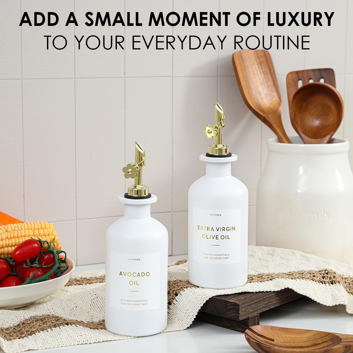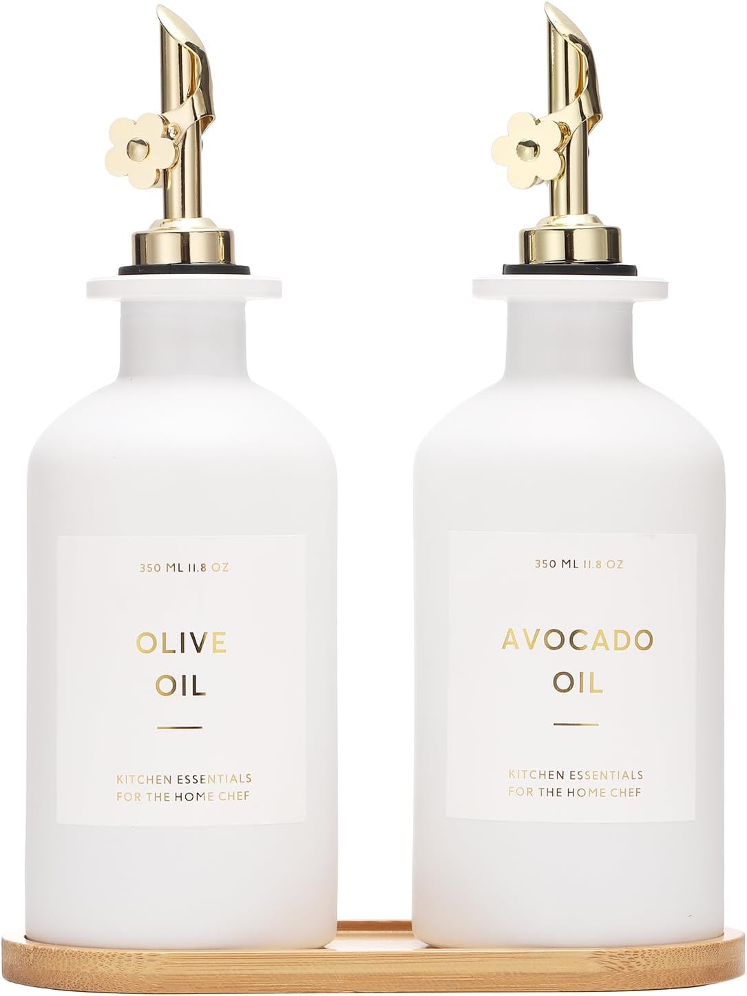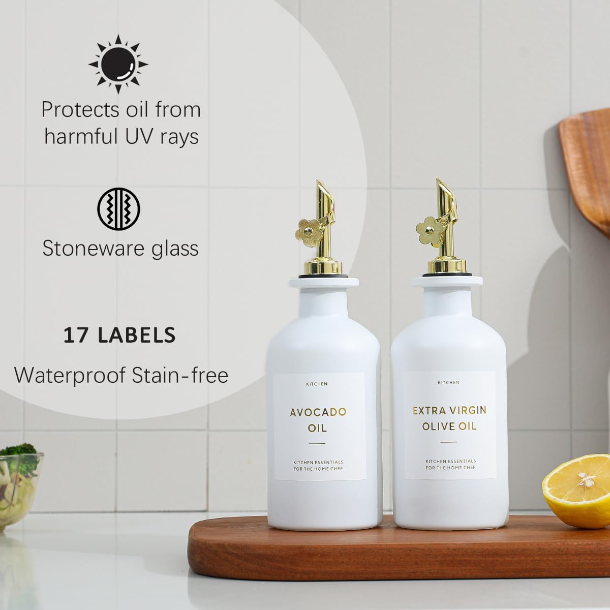 - 12oz KITCHEN OLIVE OIL DISPENSER BOTTLES – The oil and vinegar dispenser set contains 2 white 11.8oz (350ML) glass bottles, 2 gold stainless steel oil spouts, 17 waterproof labels(kinds of oil and vinegar) and a bamboo tray, Ideal for safely store and dispense your olive oil and vinegar.