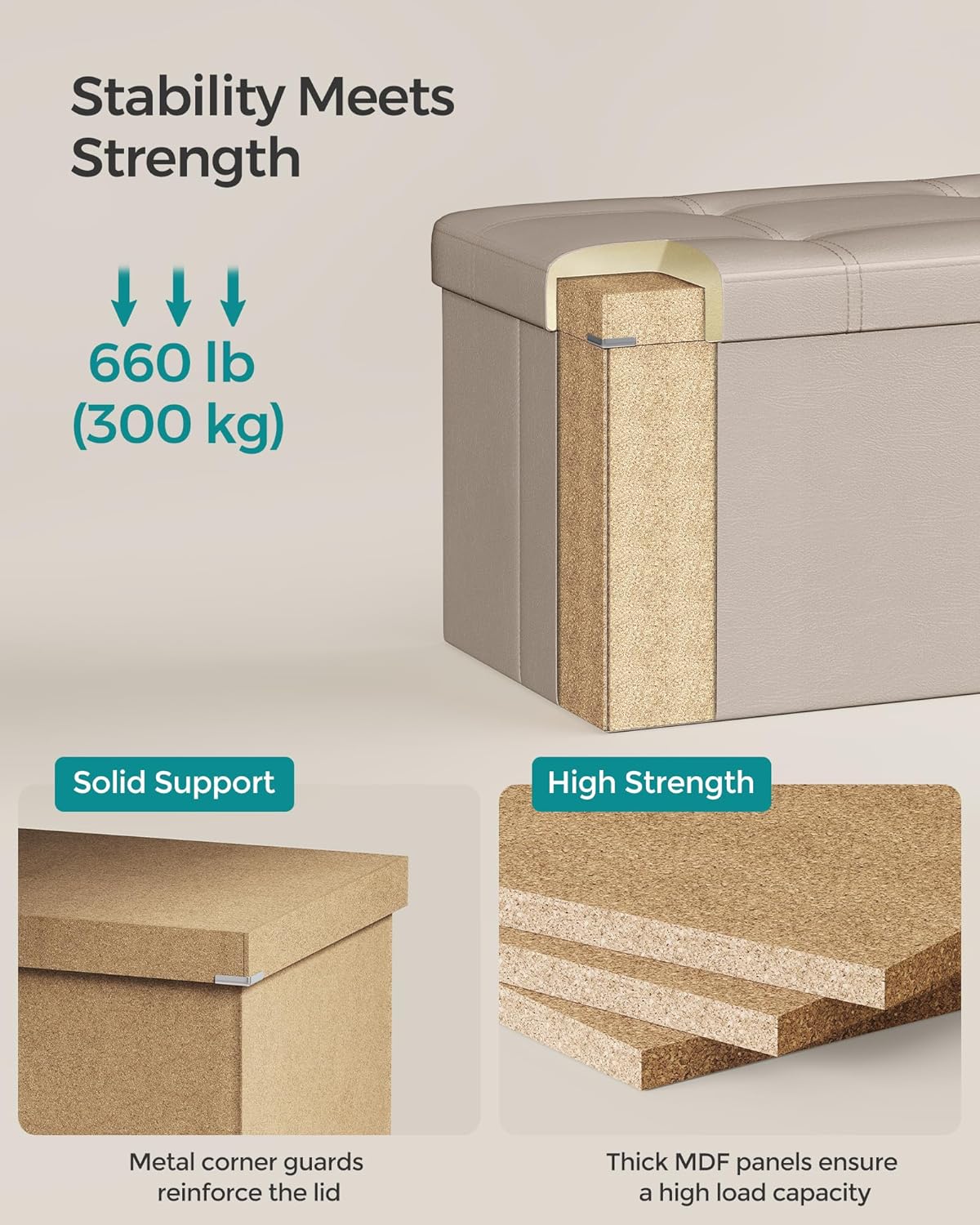 - ăGREAT STRENGTHăBuilt with thick MDF panels and reinforced with metal corner guards on the lid, this storage chest is strong enough to hold up to 660 lb (300 kg), so you can sit on it with your mind at ease