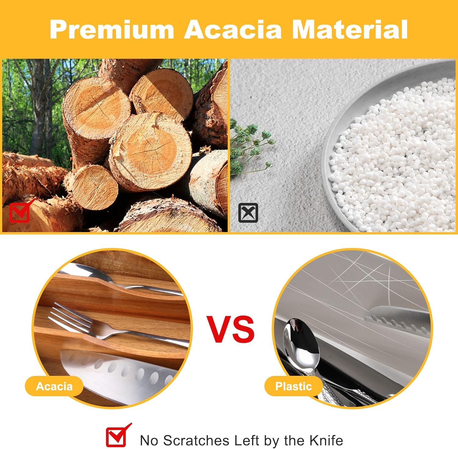 - â ăSturdy and Well-madeăOur silverware tray for drawer is made of minimally refined natural acacia, a renewable, sustainable source, making them a green choice, with the age of over 4 years, which makes the silverware holder durable enough for long time use. Unlike the plastic and metal drawer organizer, our flatware & utensil is water & odor resistant, the silverware organizing tray is perfect for years of use, especially in kitchens where things can get messy quickly.