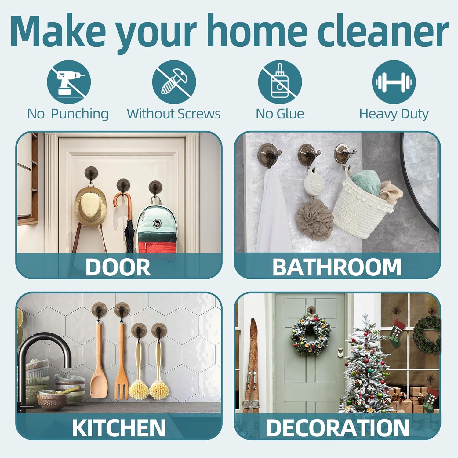 - 【Clear Hard Plastic】The Clear Suction Cup Hooks is made of premium plastic, no rust, no deformation, can perfectly organize your shower wall. Unlike Other brand in the market our suction cup hook is anti-hot-water max 158°F so your don't worry about falling off when shower hot water. Your can use it to hanging loofa, bath sponge, towel, robe, brush, clothes and more. Also suitable for outdoor glass windows Christmas wreath hanger