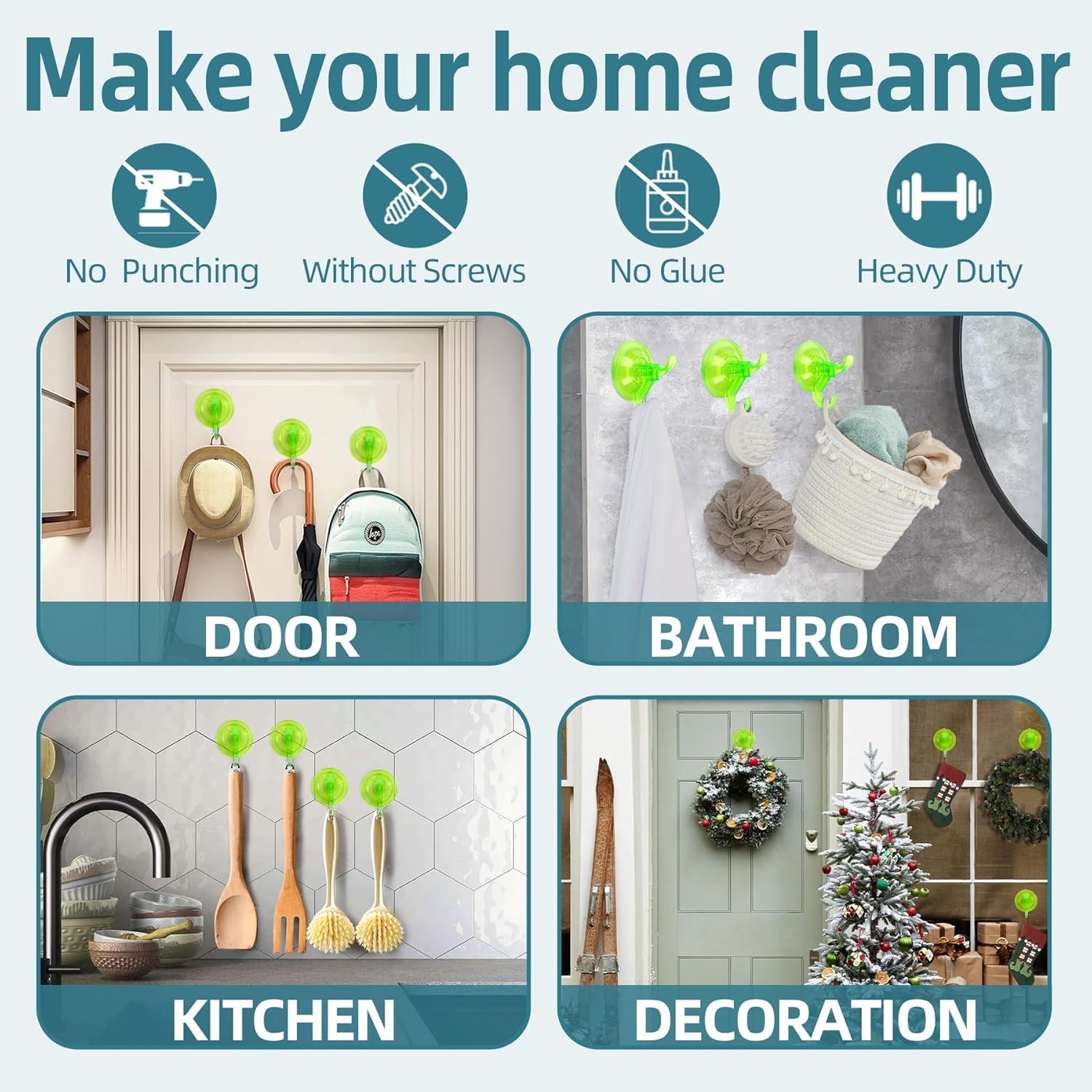 - 【Clear Hard Plastic】The Clear Suction Cup Hooks is made of premium plastic, no rust, no deformation, can perfectly organize your shower wall. Unlike Other brand in the market our suction cup hook is anti-hot-water max 158°F so your don't worry about falling off when shower hot water. Your can use it to hanging loofa, bath sponge, towel, robe, brush, clothes and more. Also suitable for outdoor glass windows Christmas wreath hanger