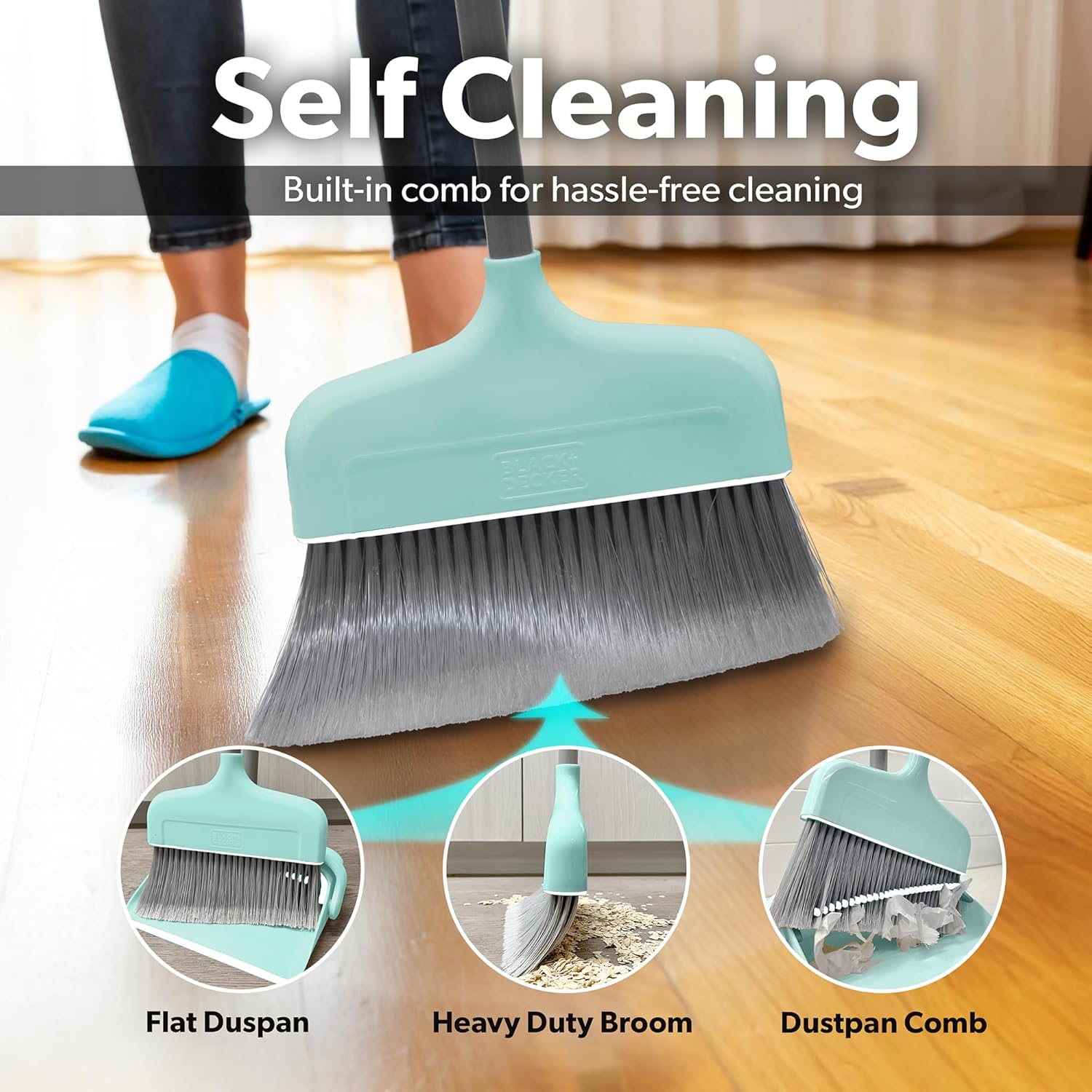 BLACK+DECKER Butler Broom & Dustpan Set - Short Handle, Stand-Up Design - Lightweight, Space-Saving Combo for Kitchen, Living Room, Bathroom, Lobby Floors - Home Cleaning Essential, Teal/Grey