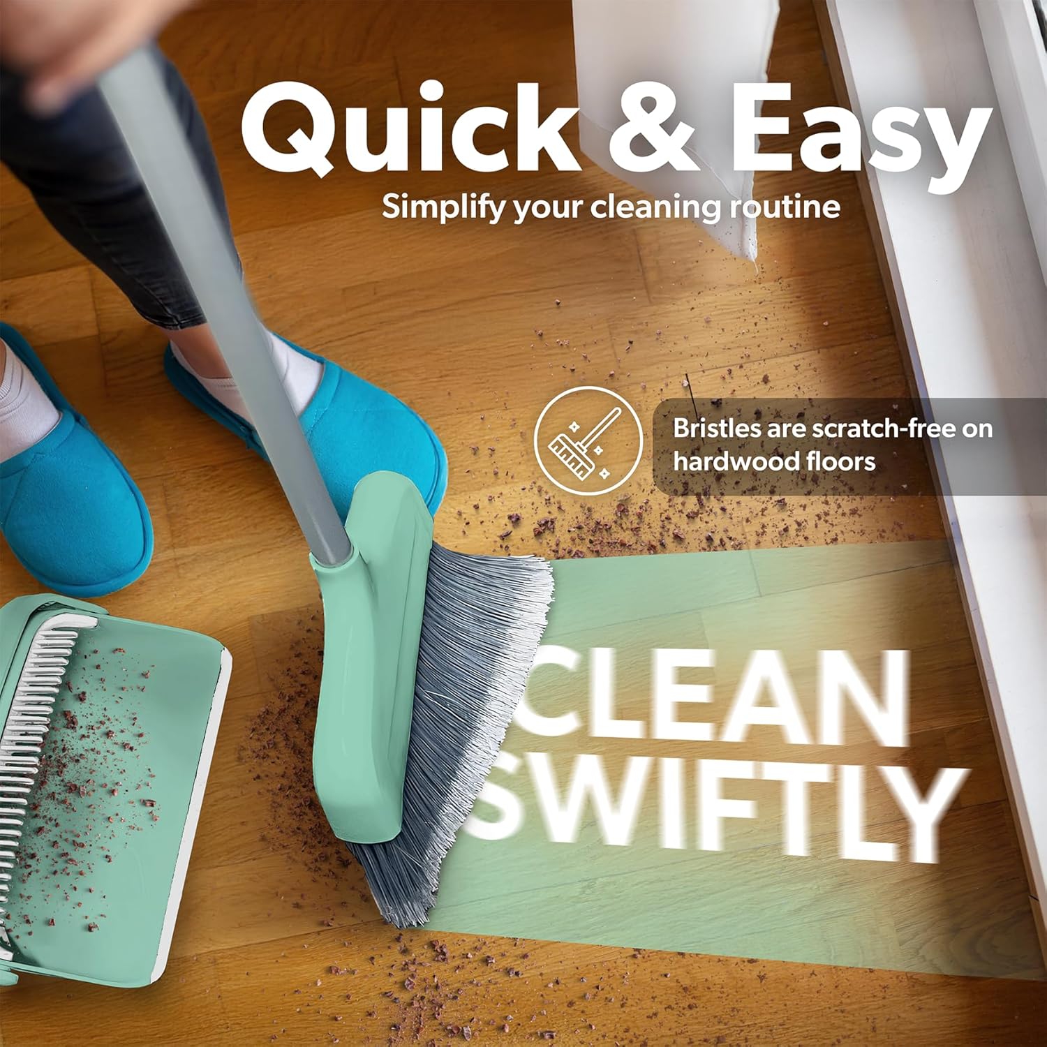 - Self Cleaning Comb Design - Sturdy teeth at the top of the dustpan comb the broom, when it collects hair/dust/lint which usually gets tangled into the bristles. Otherwise, you would need to remove them manually - not the most pleasant experience. The dustpan has a rubber lip and seamlessly sticks to the floor. It picks up everything, including the smallest particles, in the first swoop, so you will finally spend less time cleaning - more time living!
