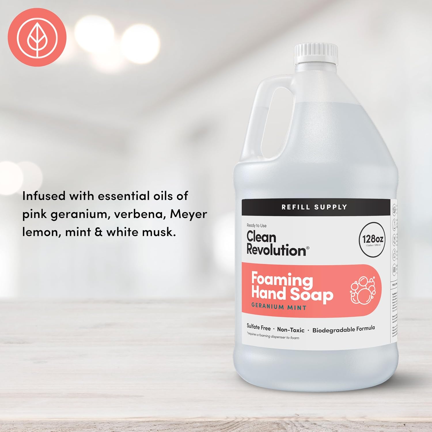 - REFILL & REUSE: Our Refill Supply container delivers exceptional value with 128 ounces of ready to use liquid foam soap designed to be used with Clean Revolution Refillable Foaming Hand Soap dispenser. This gallon jug has more than 8 refills, eliminating the need for individual single-use bottles and creating less plastic waste. Foaming Hand Soap dispenser sold separately.