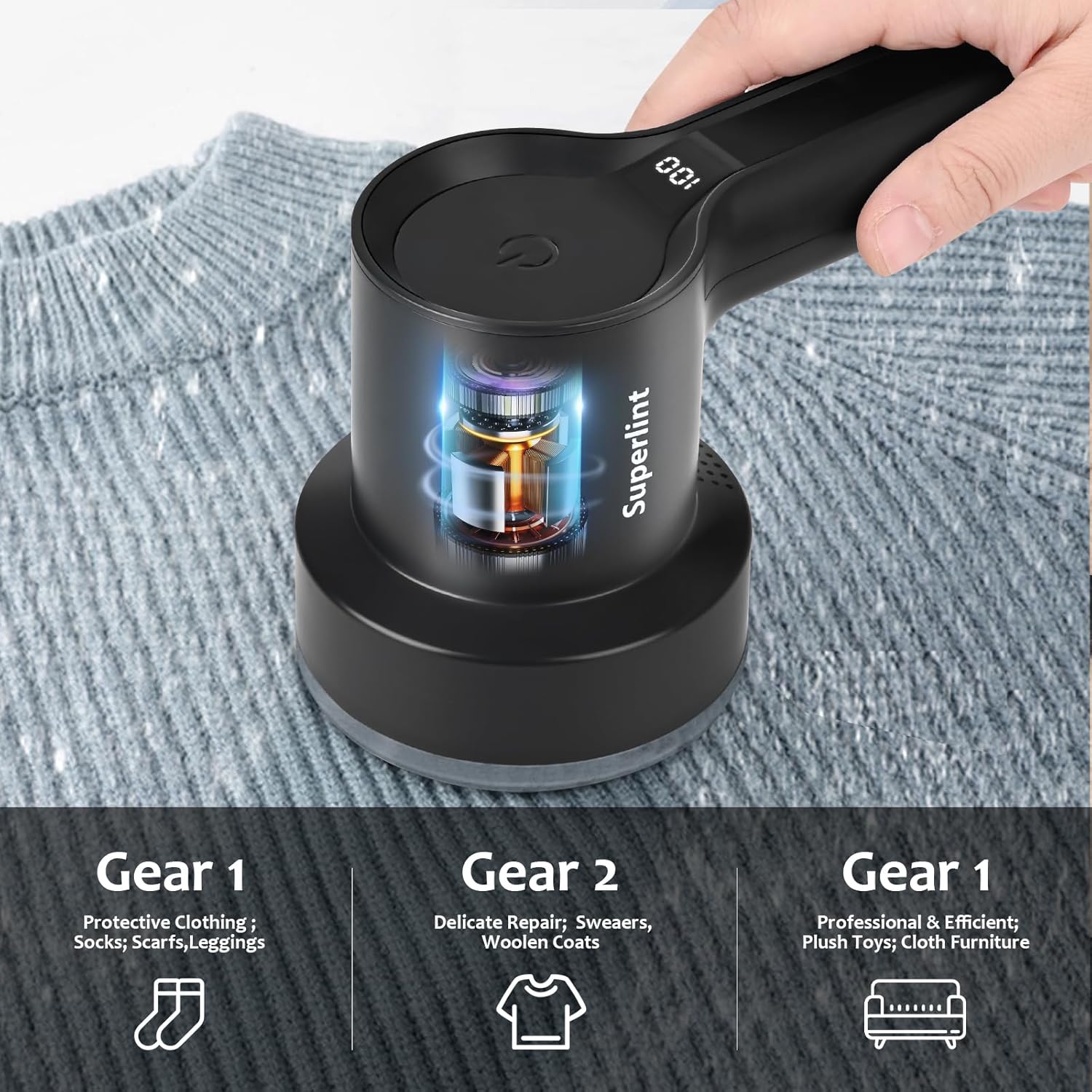 SUPER LINT Electric Fabric Shaver Electrostatic Brush, LED Display, 3-Speeds, Rechargeable Sweater Shavers to Remove Pilling for Clothing, Couch, Furniture, Black
