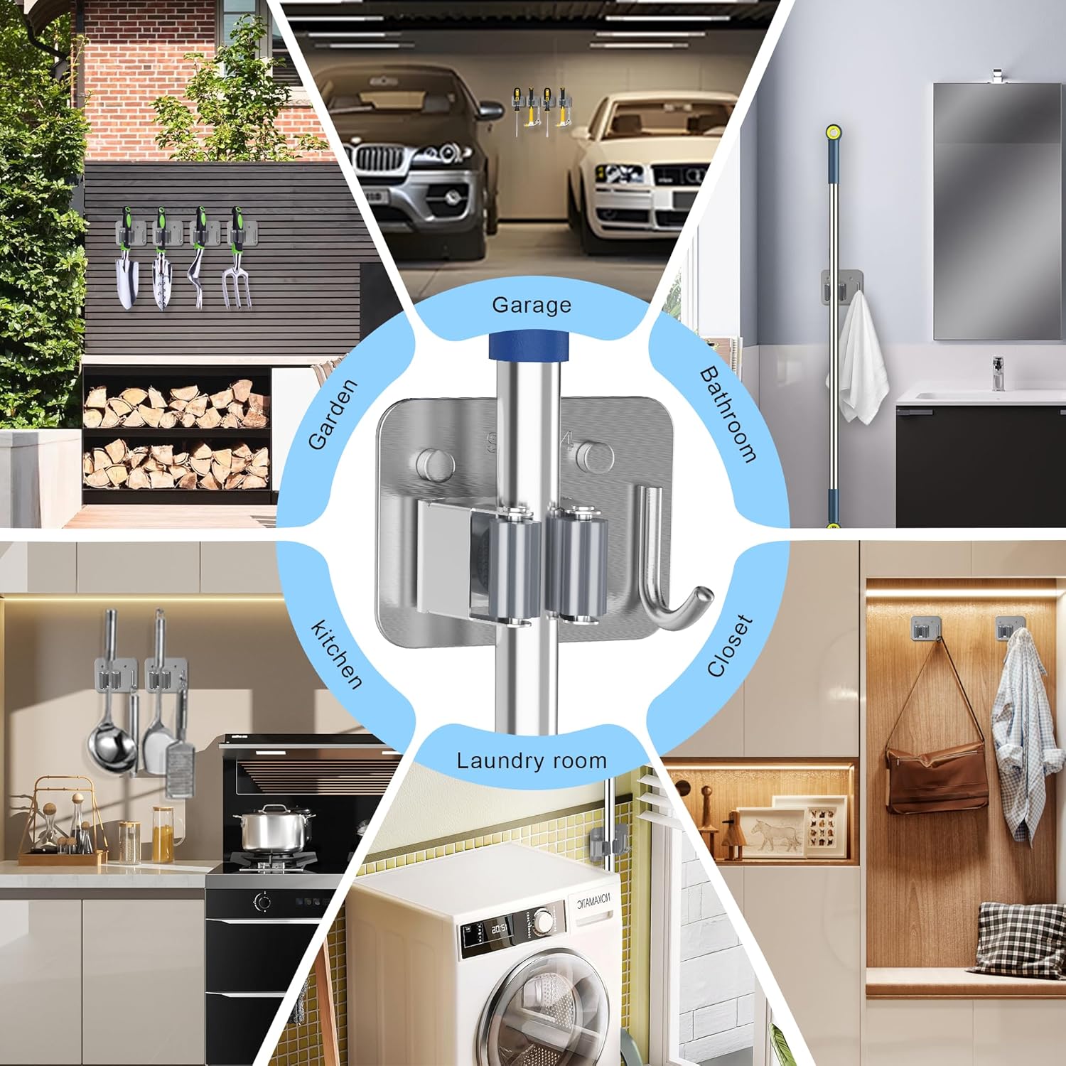 - Economical 4-Pack: This value set includes 4 broom organizer wall mount and 10 screws. Spread them across multiple rooms or create a dedicated cleaning station. The elegant silver finish complements any décor, offering both functionality and style