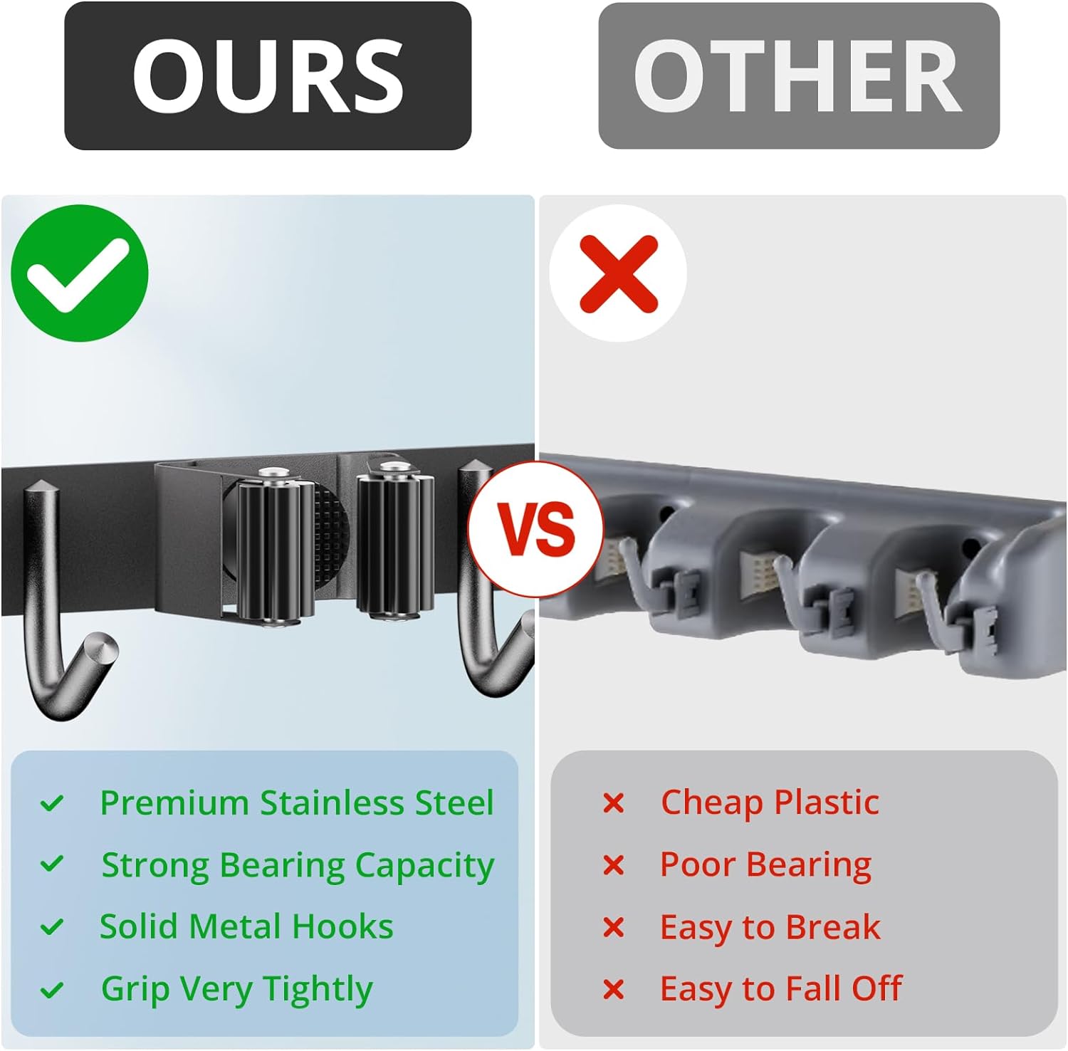 - 🏡【STURDY & BROOM HOLDER】Each broom holder wall mount has 3 racks 4 hooks. Made of sturdy 304 stainless steel, the broom holder is corrosion-resistant, rustproof and waterproof. Compared with the plastic broom rack, it is more stronger and has a longer service life.
