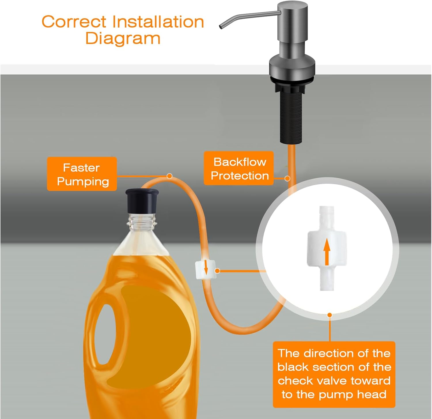 - What You Get: One soap dispenser pump head, 2 tubes, one bottle stopper to fit all soap containers, a check valve connects two-tube, anti-leak accessories and 3 fastening bolts.