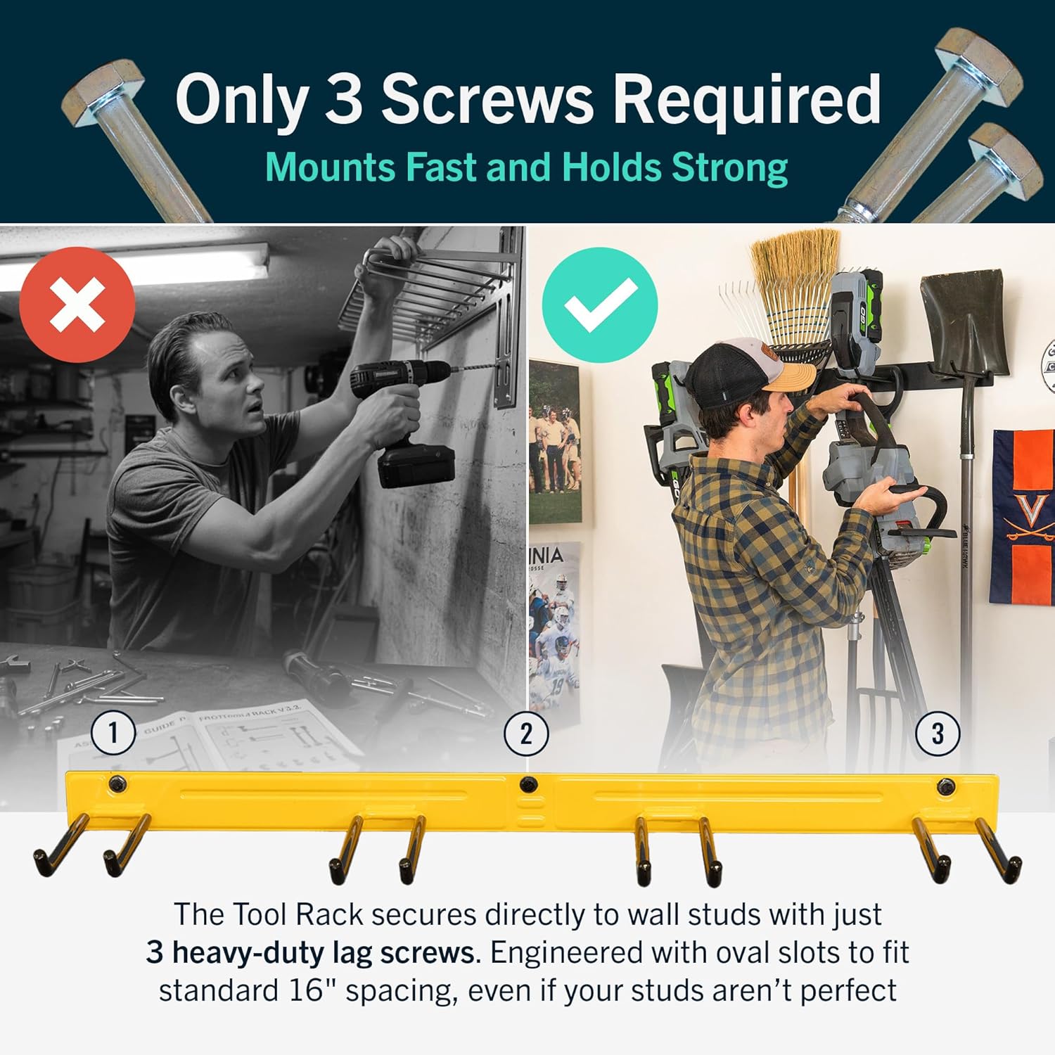- ULTRA-STRONG & BUILT TO LAST – Made from 100% solid steel with no plastic parts or assembly required, this tool rack is crafted to withstand heavy-duty use. Each wall-mounted storage rack arrives fully welded and powder-coated to resist rust and corrosion. Perfect for organizing tools, outdoor storage gear, or even a fishing pole rack for the garage.