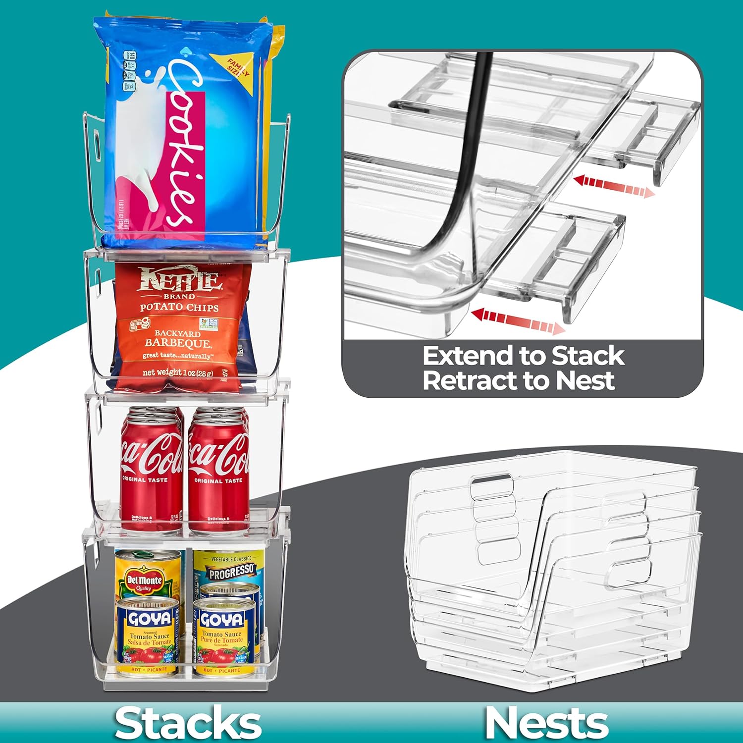 - Versatile Use: Great for storing fruits, veggies, packaged goods, yogurts, canned goods, drink boxes, baby food, condiments, cleaning supplies, bath products, makeup, and more. Versatile use as clear open front storage bins, stackable food storage bins, stackable kitchen storage, clear plastic bins for pantry, stackable cabinet storage bins, stackable bins for pantry, open bin storage basket, and stackable pantry bins
