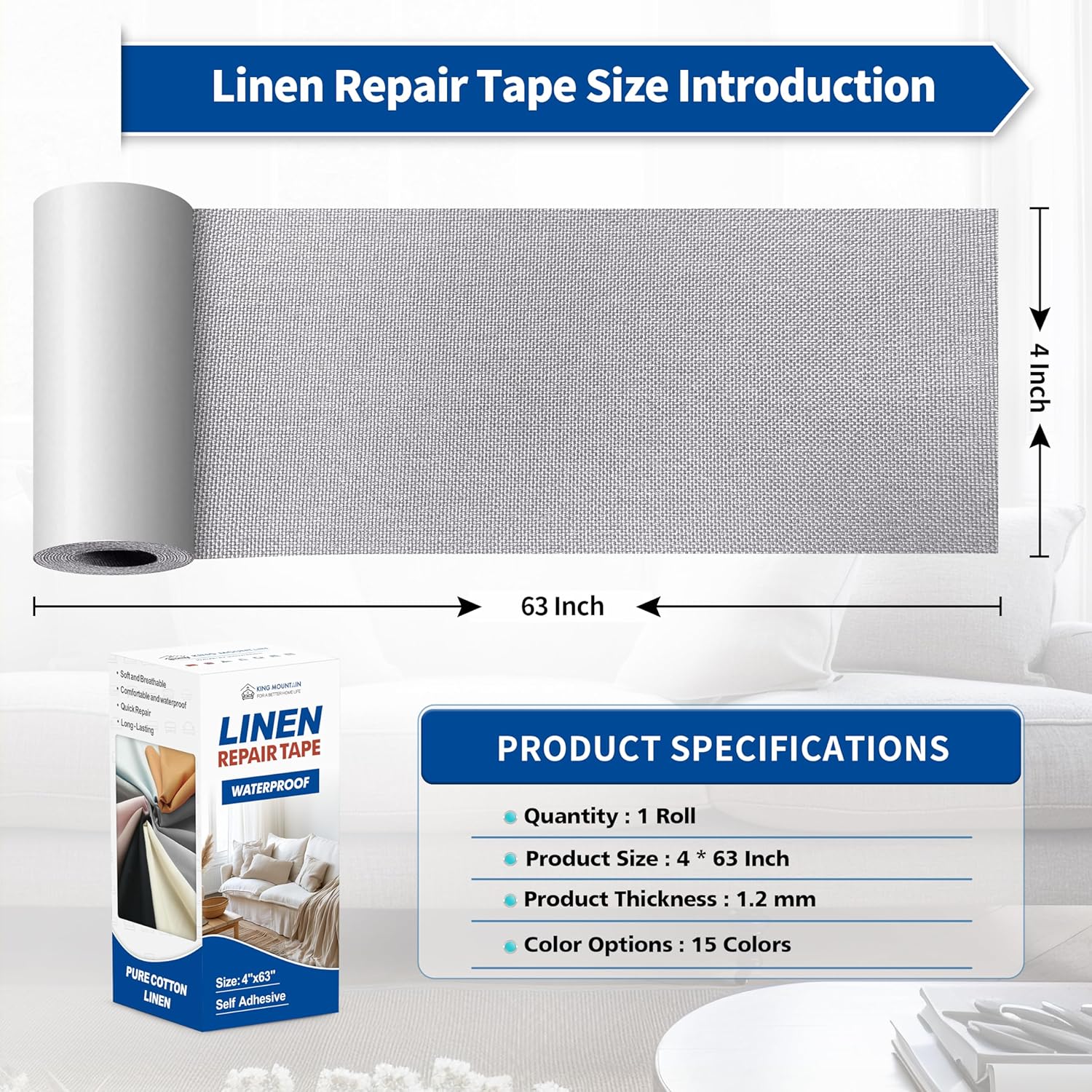 KING MOUNTAIN Linen Repair Patches, Self-Adhesive Fabric Patches, 4 X 63 inch Extra Size, Multi Color, Can be Used for Sofa Repair and Linen Clothes Repair (Light Grey 3.0)