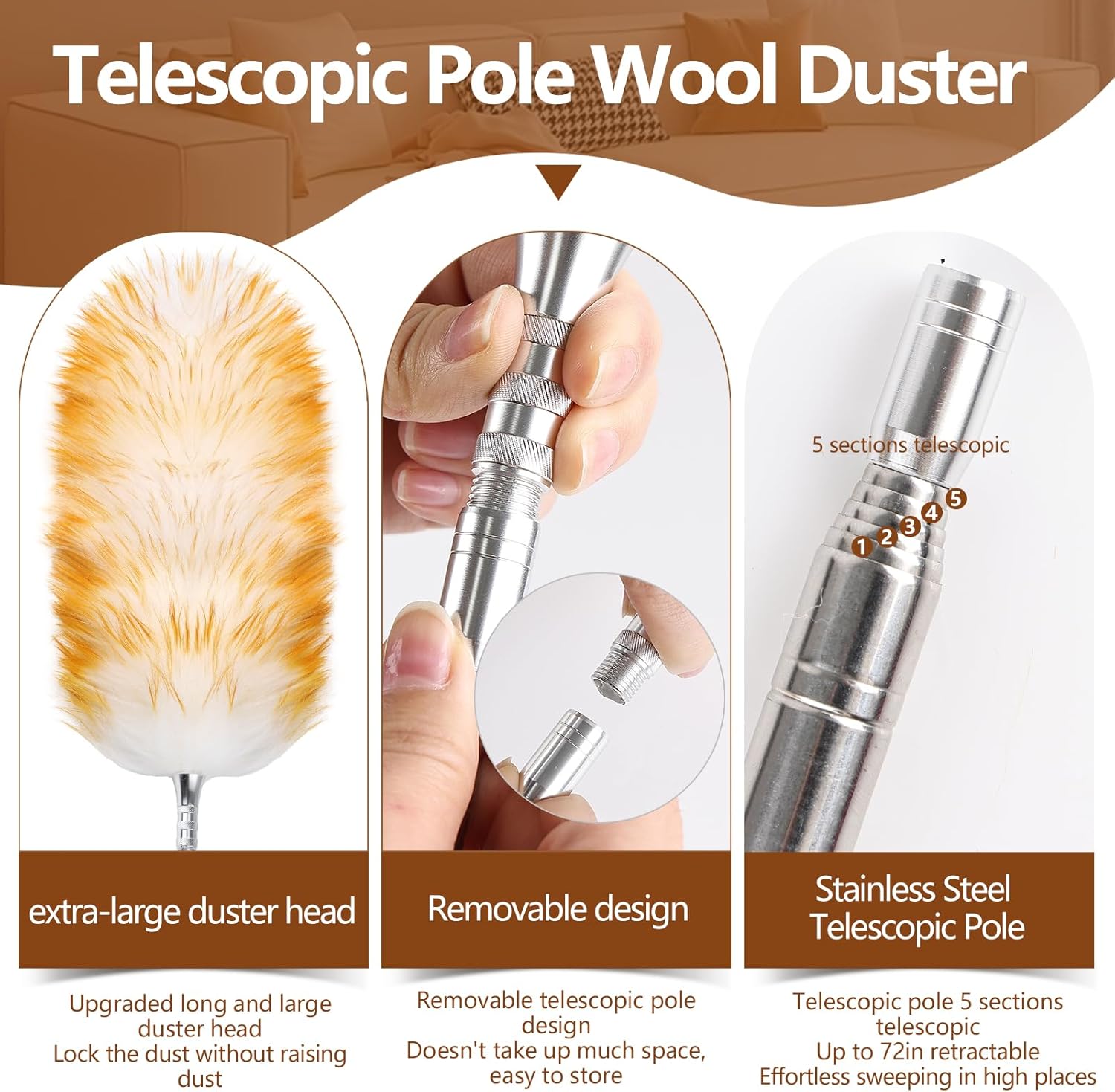 - ❤️MATERIAL: This lambswool duster is made of 100% high quality lambswool. The texture of lamb wool is very soft and fluffy, which attracts and holds dust like a magnet! Soft texture will not scratch surfaces, which can be used to clean on a variety of delicate finishes. The wool duster with extension pole will be a good assistant to help you clean your furniture and home.