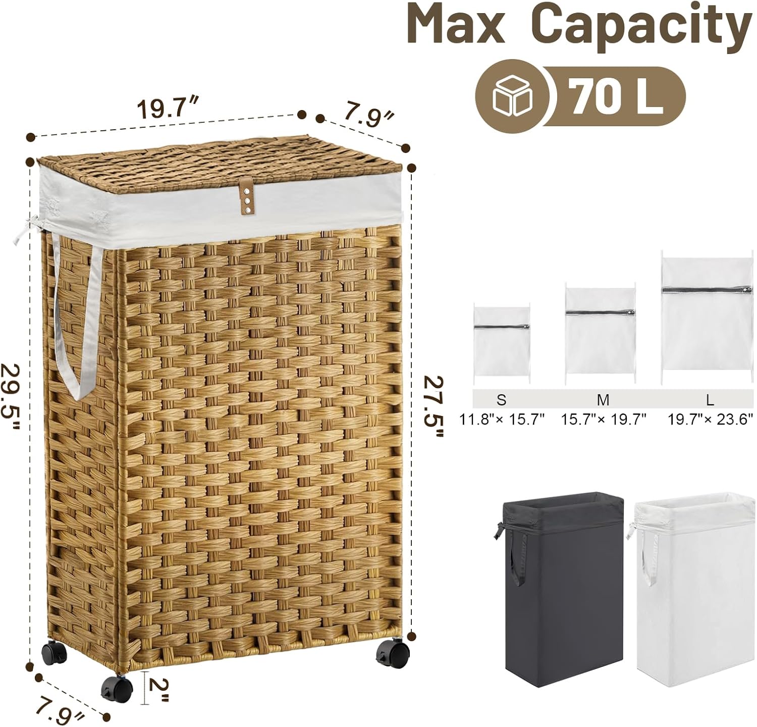 70L Slim Laundry Hamper with Lid & Wheels, 2-Park Rolling Laundry Basket with 4 Removable Liner Bags & 3 Mesh Bags, Narrow Dirty Clothes Basket, Foldable Handwoven Rattan Laundry Sorter, Natural