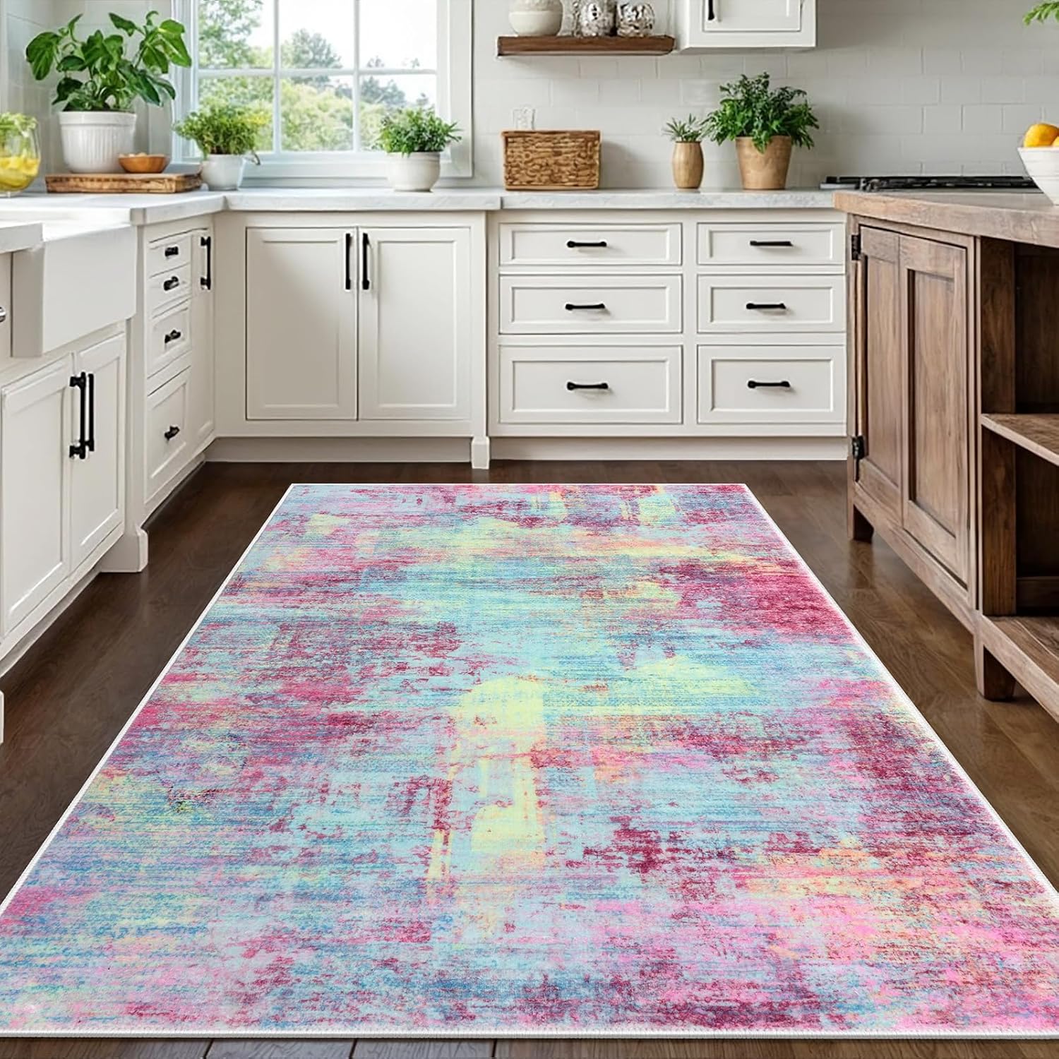 IOHOUZE Abstract Area Rugs 5x7 Ft Washable Rugs for Living Room, Non Slip Dining Room Rug, Printed Faux Wool Rugs for Bedroom, Floor Carpet for Office Nursery Playroom, Pink Teal