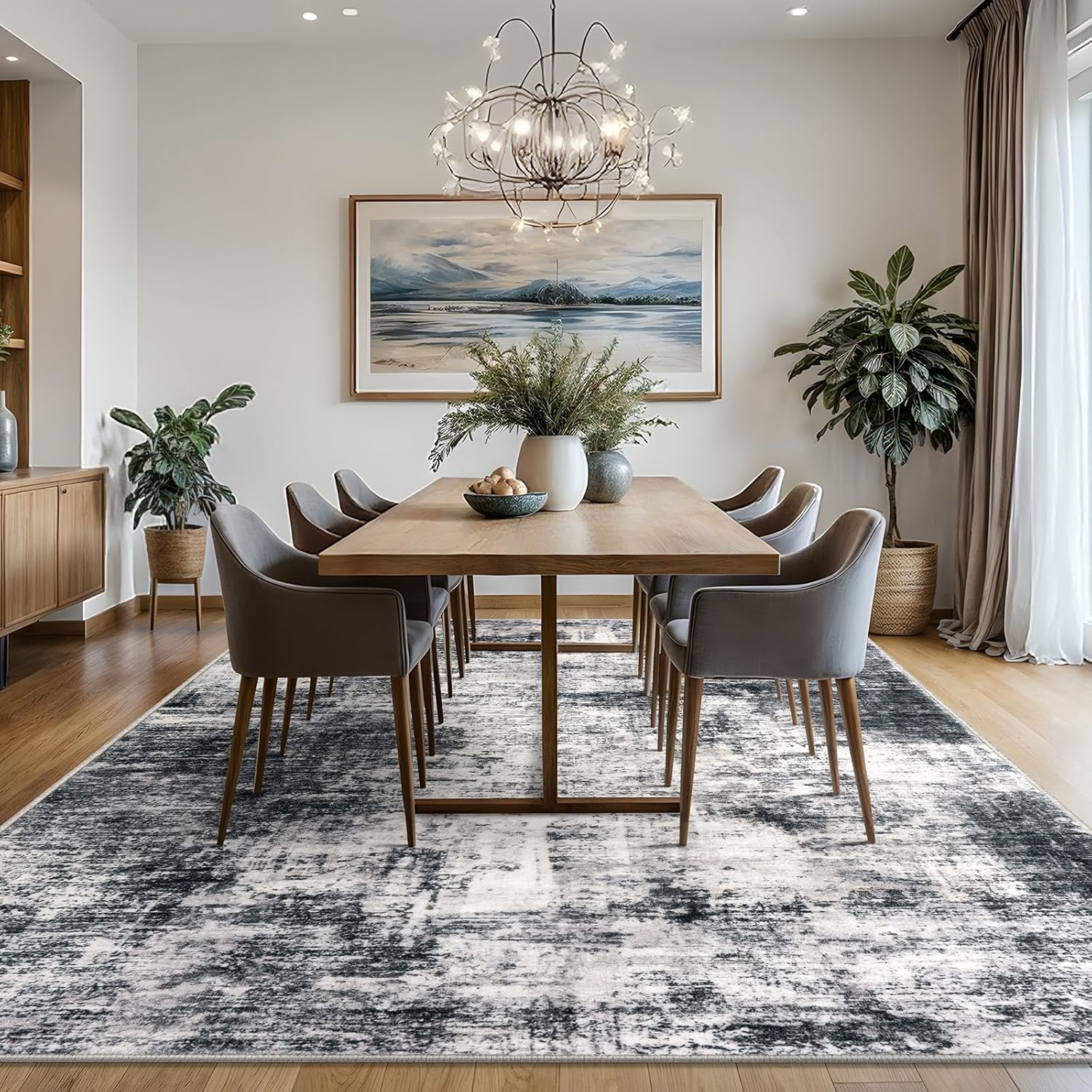 IOHOUZE Abstract Area Rugs 8x10 Ft Washable Large Rugs for Living Room, Non Slip Dining Room Rug, Printed Faux Wool Rugs for Bedroom, Floor Carpet for Office Nursery Playroom, Black Grey