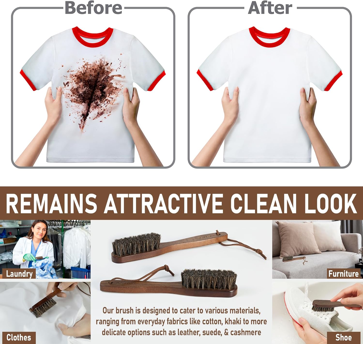 - Ultra-soft natural horsehair bristles: Specially chosen for their softness, these genuine horsehair bristles are ideal for cleaning delicate materials like silk, wool, cashmere, fine cotton, and synthetics without causing pilling, snagging, or damage like stiffer brushes might (always test first).